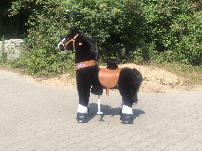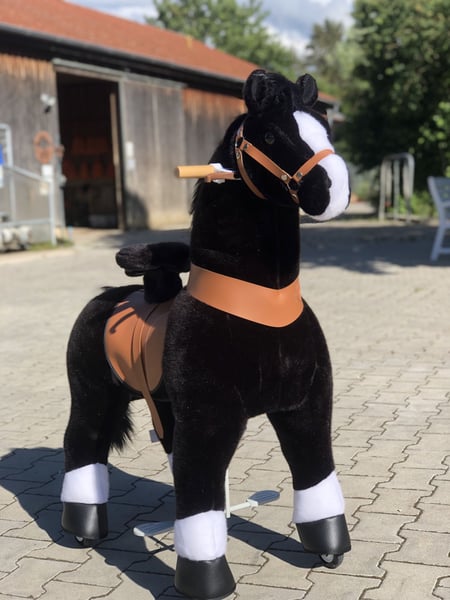 Our pony Blacky fulfills all children's and parents' wishes! He is always calm and composed, well-behaved and easy to handle. He is easy to feed, never sick and doesn't need a farrier. Does not bite or strike. With a back height of 70 cm, children can learn to trot easily, strengthen their muscles and build up their stamina before switching to a real riding pony. The ideal addition for all riding schools to take the pressure off the school ponies and prepare the children for a real pony with lots of fun. This pony is an L pony, we also offer the M pony one size smaller for 299 € incl. VAT and shipping. You are welcome to test ride the pony at our riding school.
