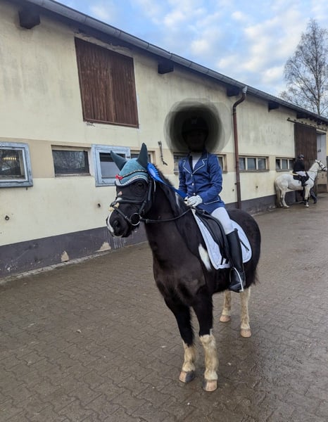Rocky is a pony that brings a smile to everyone's face every day. With his open-hearted and charming nature, he wins everyone over effortlessly. We purchased him as a foal in 2018 and have gently backed him. Initially, he can be a bit wary of unfamiliar riders, but once he trusts someone, there’s nothing standing in the way of a bond of unconditional friendship. Over the past few years, Rocky has developed into a solid children's pony, with wins in lead-rein classes and rider competitions. He has been placed multiple times in dressage at E-level and has also achieved a placement in a jumping rider class. At home, he jumps a solid E-level course and also tackles larger obstacles. Additionally, he loves free work and learning tricks just as much as long, relaxed rides. Due to his equine asthma and a large laryngeal cover, he can only be rehomed into an airy paddock with dust-free bedding and steamed hay. As a result, he is being offered at a significantly reduced price. Thanks to this approach, including proper housing and inhalation therapy, Rocky has been clinically and symptomatically almost unremarkable for years. We wish for Rocky to find a new home where he can make new equine and human friends who will love him as much as we do. He will be sold with full tack, including two Prestige saddles and matching bridles. Priority over price.