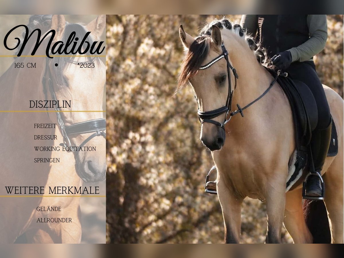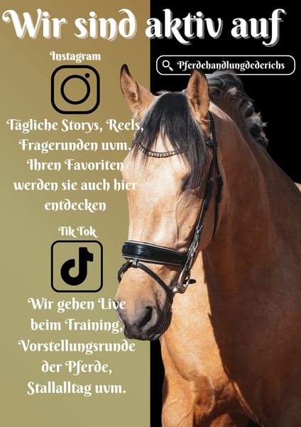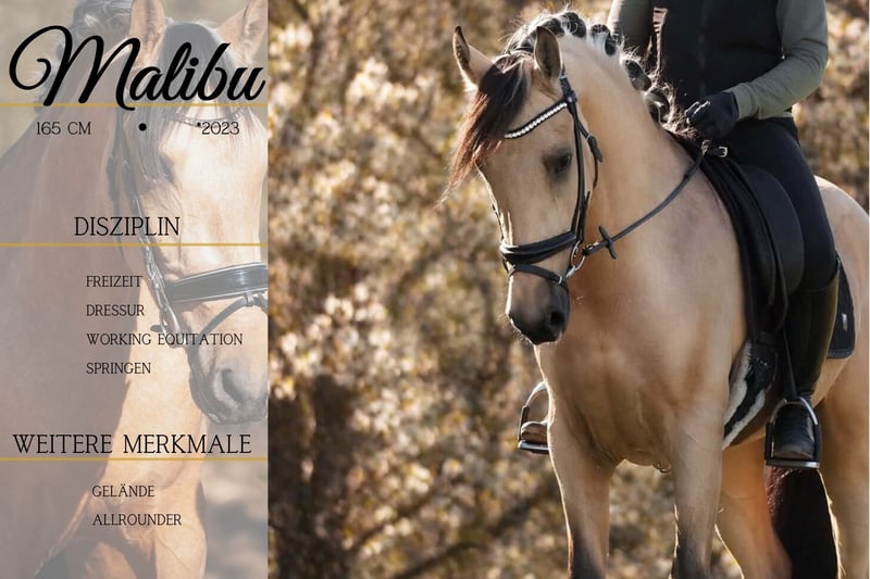 Malibu ist ein Falbwallach ca. 165cm *Malibu* ist ein Pferd das alle Blicke auf sich zieht. Wunderschöner super cooler Allrounder. Er ist schön zu reiten in der Bahn, bringt 3 gute und bequeme GGA mit und vermittelt ein sicheres Gefühl. Nervenstark und sehr unerschrocken. Geht alleine und in der Gruppe raus, fremde Umgebungen sind überhaupt kein Problem. Malibu geht gerne ins Wasser, hat kein Problem mit Fahrzeugen, Planen, Lärm etc. Vielseitig mit genügend Potenzial ausgestattet. !!! SCHAUEN SIE SICH UNBEDINGT SEIN VIDEO AN !!! Er ist verspielt, Menschenbezogen und liebt es umsorgt zu werden. Malibu bringt alles mit, was man sich nur wünschen kann. Ein aktuelles Video finden Sie hier in der Anzeige oder unter folgendem Link: https://www.youtube.com/watch?v=xvv_NweSqeY Pferdehandlung Dederichs – Ihr Partner für den Pferdekauf Kontakt & Erreichbarkeit: Anfragen bitte ausschließlich telefonisch unter 0173/9792139 Montag – Freitag: 09:00 – 18:00 Uhr Samstag: 09:00 – 15:00 Uhr Sonntag: Ruhetag Folgen Sie uns auf Social Media! Erleben Sie unseren Alltag mit den Verkaufspferden auf Instagram, TikTok & Facebook unter Pferdehandlung Dederichs Rabatt: Bei sofortiger Mitnahme Ihres neuen Traumpferdes erhalten Sie zwischen 5 %– 10 % Rabatt Probereiten & Vorführen: • Probereiten: 40 € pro Pferd (max. 2 Reiter), Betrag wird beim Kauf angerechnet • Feiertage: Proberitt 50 € • Vorführung durch unsere Bereiter: 30 € pro Pferd (Vorreiten, Bodenarbeit etc.) Ankaufsuntersuchung & Transport: • Viele unserer Pferde besitzen bereits eine AKU • Sie können selbstverständlich Ihren eigenen Tierarzt mitbringen • Gerne organisieren wir eine Untersuchung • Wir unterstützen Sie auch gerne beim Transport ins neue Zuhause Weitere Verkaufspferde: In unserem Stall stehen weitere Verkaufspferde, die noch nicht online sind. Falls Ihr Traumpferd noch nicht dabei ist, zögern Sie nicht, uns zu kontaktieren. Wichtige Hinweise: • Stockmaß-Angaben sind geschätzt und nicht exakt nachgemessen • Alle Beschreibungen sind subjektive Einschätzungen des Verkäufers und keine zugesicherten Eigenschaften