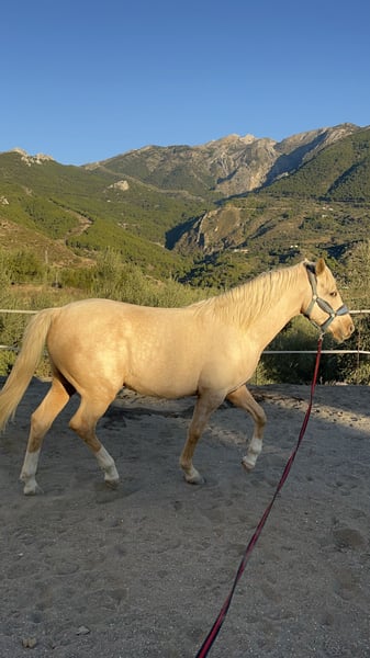 Elegant Palomino Gelding for Sale Discover the charm of this beautiful Palomino gelding, born in 2020, standing at 155 cm. With his striking coat and graceful presence, he is sure to turn heads wherever he goes. Bitless and barefoot which makes this boy even more special. Specialized from the begining in English Pleasure, he demonstrates smooth, comfortable gaits and a calm, willing demeanor—perfect for riders seeking a reliable and stylish partner. Whether you want to compete or enjoy leisurely rides, this versatile horse is ready to meet you and grow with you. Well-handled and with a friendly temperament, he is suitable for riders of various levels. Don't miss the opportunity to add this lovely horse to your stable!