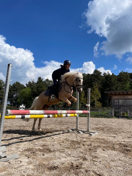 Golden Sky ist ein echtes Goldstück für Reiter mit Erfahrung Er ist ein Allrounder bis zur Springklasse E – egal ob Dressur, Gelände oder Springen, er macht alles mit und gibt immer 100%. Sein Charakter? Sehr herzhaft und liebevoll. Er sucht die Nähe, freut sich über Streicheleinheiten und hat ein riesiges Herz. Gleichzeitig hat er aber auch einen starken Charakter und weiß genau was er will. Er testet gerne mal und braucht deshalb eine klare, faire Hand. Temperament hat er reichlich. Unter dem Sattel ist er fleißig und arbeietet immer gerne mit. Seine Konzentration ist zu immer zu 100% beim Reiter. Kurz gesagt: Ein Pony mit viel Herz, Temperament und einem starken Willen. Nichts für Anfänger, aber für den passenden Reiter ein absoluter Traum-Allrounder.