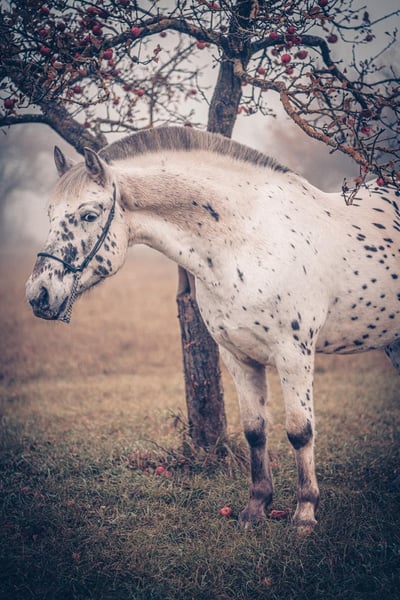 Here comes a curious Baroque gelding who is sure to win hearts effortlessly. Mikus has been in full training for approximately six months and already rides confidently at novice level. He is very finely ridden and responds well to aids. In the field, he is gentle, eager, and generally unshy, while in the arena he is very eager to learn and cooperative. Due to his Baroque conformation, he covers well and is generally quite relaxed. Even with beginners lunging him, he remains gentle and patient. During the day, he is turned out with a large herd on the trail, and at night he stays in his box. Currently, he is barefoot. Dogs and cats are no problem, and tractors with a confident rider are also fine. He is naturally farrier- and loading-friendly. For an additional fee, he can be sold with complete tack (bridle, saddle, blankets, and more). His passport lists him as a Polish Warmblood, but experts suspect he may be a Knabstrupper. He has been regularly dewormed, vaccinated, and examined by a chiropractor, and is in excellent health. To avoid re-ride tourism, we charge a pre-approval fee of €50, which will be deducted from the purchase price. We kindly ask that only serious inquiries are made.