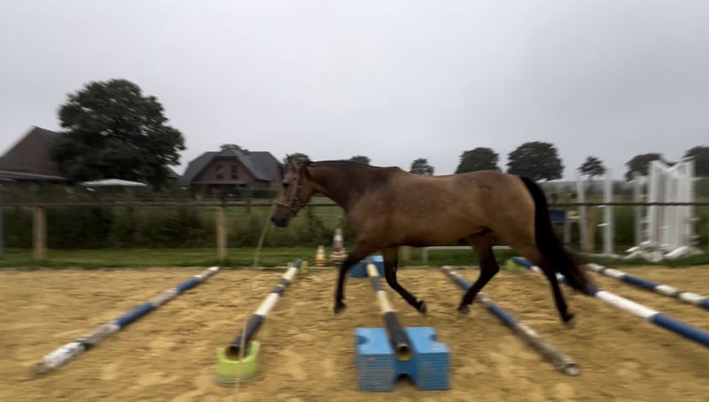 With a heavy heart, I have to sell my soulmate horse. Since he will only be sold into the very best hands, please read the ad carefully and only contact me if you have sincere interest in welcoming him into your life as a family member, partner, and friend. Turrón is an import Spanish (Conjunto Mestizo), in the beautiful "Bay" color, and has been by my side for five years. He is generally very people-oriented. However, he tends to form a close, special bond with his main handler and is therefore not a "family horse" or suitable for constantly changing riders. In terms of character, he is sensitive, playful, affectionate, intelligent, dominant, curious, and calm. He can be very subtle with body language, voice commands, or rider aids, but he can also try to assert his own will. Therefore, the person working with him should be calm, loving, consistent, confident, and fair. Turrón loves varied activities. Groundwork, Equikinetic, circus tricks, cavaletti work, walks, rides, etc. He is a "cool cat" and feels very comfortable in the terrain—both alone and with other horses. He has been ridden mainly in Western leisure riding but has also gained some experience with a riding instructor in groundwork and classical dressage (side movements, recently also renvers and travers in walk and trot, extending steps in trot, and half-steps on the way to piaffe. Also started with the Spanish walk under saddle) -> https://jennifer-pecat.de. Due to his breed, he was only backed late and with a lot of time. He is very herd-compatible and has even been kept with mares; however, for his nervous system, a herd of geldings is preferred. Since October, he has found his home in a private open stable in Oberkrüchten. I would very much like for him to stay there, as he clearly feels comfortable. It is a small, consistent herd that provides him with security and calm. His play and grooming needs are met. A 6-star deluxe VP stable—also for the human—would be ideal. Also important are opportunities for movement and retreat, as well as limited pasture turnout (2 hours per day, with very slow grazing). Due to his origins, he tolerates little pasture and is fed accordingly to a Mediterranean metabolism. Turrón is barefoot. Unfortunately, he is allergic to straw and pollen (currently taking Loratadine during pollen season). Otherwise, we have been fortunate—no colics, serious injuries, or other issues. He is vaccinated regularly (tetanus, influenza) and dewormed. He even allows his teeth to be floated bravely without sedation. He loads easily onto the trailer and remains calm during transport. Turrón is sold with accessories. These are high quality (Rieser, Signum, Hilburry, etc.) and are included for an additional €1,500. A veterinary health check (AKU) can be arranged at the buyer’s expense with a trusted veterinarian at Turrón’s stall. Provisional riding tests cost €40, which will be credited towards the purchase price if he is bought. *All information is provided to the best of my knowledge, but as this involves a living animal, no guarantee can be given.*