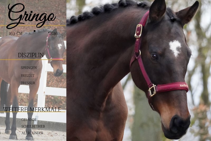 Gringo is a 2016-born gelding, approximately 16.1 hh, sired by Fame and Glory out of Montjeu x Lavrico, Saint Preul. *Gringo* is a stunning all-rounder. He is ideal for riding schools and training centers. Gringo is well-behaved both in the arena and in the field, as well as in unfamiliar surroundings. He also enjoys jumping and shows enthusiasm for it. He is very affectionate and gentle in handling. An uncomplicated gelding that brings a lot of joy and makes you feel very comfortable. Horse Trading Dederichs – Your Partner for Horse Purchases Contact & Availability: Please inquire exclusively by phone at 0173/9792139 Monday – Friday: 9:00 AM – 6:00 PM Saturday: 9:00 AM – 3:00 PM Sunday: Closed Follow us on social media! Experience our daily life with the sale horses on Instagram, TikTok & Facebook under Pferdehandlung Dederichs Discount: Receive a 5% – 10% discount when taking your new dream horse immediately Test Rides & Demonstrations: • Test ride: €30 per horse (up to 2 riders), amount credited upon purchase • Public holidays: €50 for a test ride • Demonstration by our grooms: €25 per horse (pre-riding, groundwork, etc.) Pre-Purchase Examination & Transport: • Many of our horses already have a pre-purchase exam (AKU) • You are welcome to bring your own veterinarian • We can organize an examination for you • We are happy to assist with transport to your new home Other Sale Horses: We have additional horses for sale that are not yet listed online. If your dream horse is not yet among them, please do not hesitate to contact us. Important Notes: • Height information is estimated and not precisely measured • All descriptions are subjective assessments by the seller and do not constitute guaranteed properties