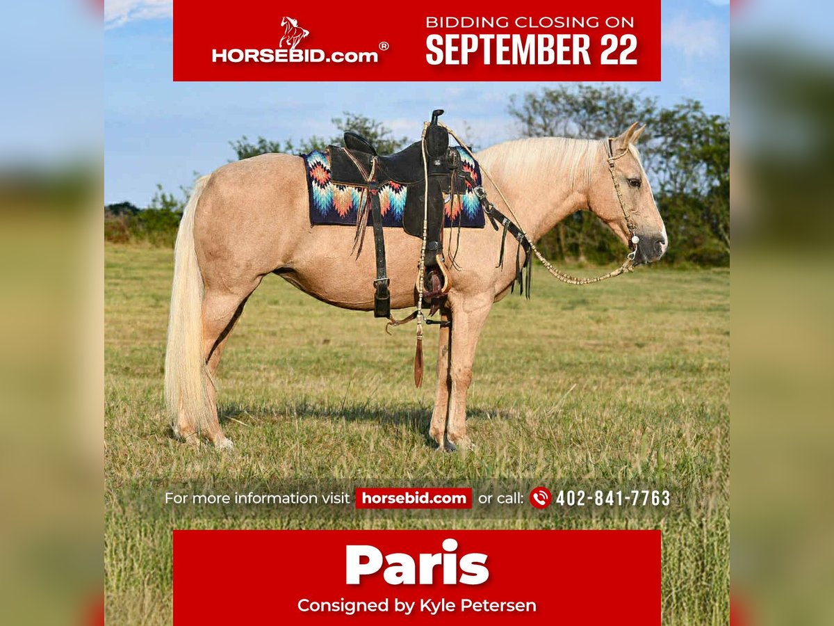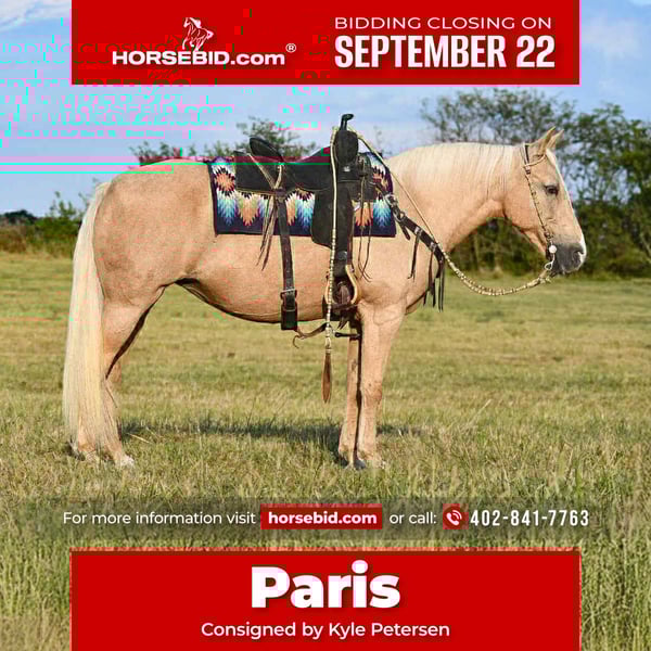 🍁𝒕𝒉𝒆 𝐅𝐀𝐋𝐋 𝑺𝒑𝒆𝒄𝒕𝒂𝒄𝒖𝒍𝒂𝒓🍁 Happening now thru MONDAY | SEPTEMBER 22nd - Available EXCLUSIVELY on HorseBid's website! For more details and to register visit: www.Horsebid.com CONSIGNOR CONTACT: Kyle Petersen 402-841-7763 LOCATION: Corsica SD BREED: Gaited REGISTERED: No REGISTERED NAME: Paris COLOR: Palomino HEIGHT: 15 AGE: 11 GENDER: Mare Paris is one cool don’t want to miss her, Paris stands 15 hands and a very shape he made gorgeous palomino gaited mare. She is 11 years old, she has been trail ridden over the country rides in front of back of the group and not spooky and traffic safe, Paris is super broke and very gentle great down the trails level headed and super fun and easy to handle and ride, she is good to catch, good for farrier and vet, loads unloads and hauls good. Safe for all ages and levels of riders, she is 100% sound she is a super easy keeper, a super nice mare anyone would love to have in the family.