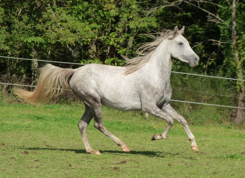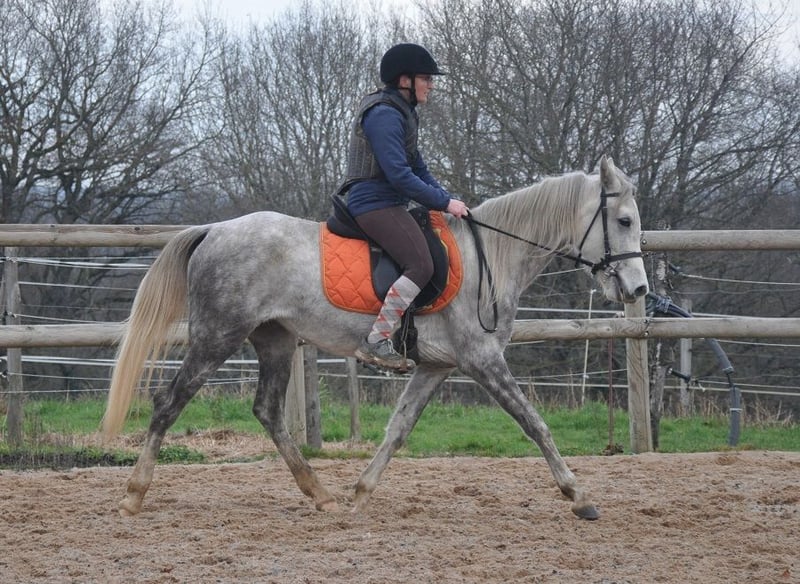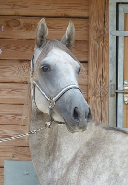 Madonna ONC (arabe) Jument 4 ans 1m46 Madonna est d'une grande douceur, elle est aussi intelligente que bienveillante et il suffit de lui expliquer une fois pour qu'elle comprenne et donne ensuite la bonne réponse. Elle est montée en filet et en licol aux trois allures. On pourrait très vite aller vers une équitation en cordelette avec elle tant elle est à l'écoute de son cavalier. Elle connaît l'incurvation, les déplacements des épaules et des hanches ainsi que le reculer. Elle commence à se tendre et à travailler dans décontraction et la rondeur, c'est une petite jument très agréable sur le plat, elle est fine dans les aides, en avant tout en étant posée dans sa tête. Elle a commencé l'obstacle, elle enchaîne un petit parcours simple au galop. Elle est franche ce n'est pas une jument regardante. Elle sort seule en extérieur aux trois allures, elle y est aussi à l'aise qu'en carrière. Elle n'est pas peureuse ni inquiète de nature, elle est déjà confiante, elle découvre tout avec intelligence. Madonna pourra convenir à tous les profils de cavaliers, petits niveaux (à partir d'un galop 3 pour l'instant) comme plus élevés.Elle est polyvalente, elle pourrait faire une bonne jument de club. La seule contrainte est qu'elle est très fine, elle ne peut convenir que pour des cavaliers très légers, max 60 kg tant que la croissance n'est pas terminée. Elle monte et voyage bien en van. Elle est à jour de parage, vaccins, vermifuge et dentiste. Madonna est visible à Saint-Romain-sous-Gourdon (71230) en Saône et Loire