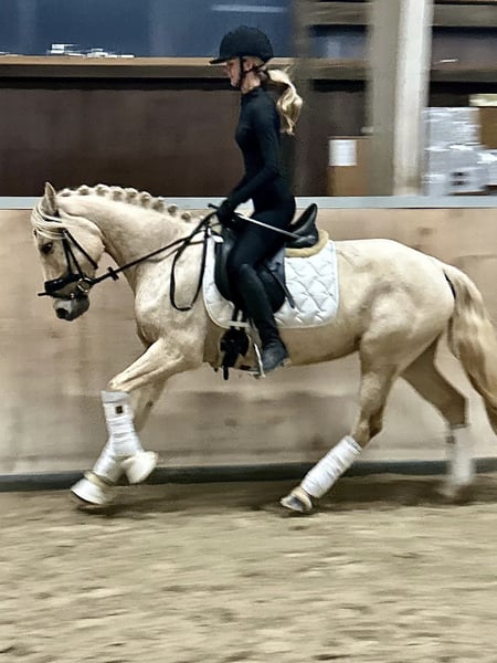 Unsere bezaubernde Palomino-Stute (4 Jahre, ca. 1,47 m) sucht ein liebevolles Zuhause, in dem sie mit Geduld, Zeit und Vertrauen in Ruhe weiter gefördert wird. Sie ist ein Pferd mit viel Herz, Charme und Charakter – eine echte Persönlichkeit, die ihren Menschen fürs Leben finden möchte. Diese Stute ist menschenbezogen, verschmust und sehr aufmerksam. Sie liebt es, im Mittelpunkt zu stehen, sucht Nähe und möchte gefallen. Dabei braucht sie jemanden mit Erfahrung, Gefühl und Geduld, der ihr Sicherheit schenkt und sie liebevoll, aber konsequent führt. Hat sie einmal Vertrauen gefasst, geht sie mit ihrem Menschen durchs Feuer. Sie befindet sich derzeit auf einem soliden A-Niveau in der Dressur und zeigt dort wie auch am Sprung viel Freude und Talent. Sie arbeitet gerne, lernt schnell und möchte gefordert werden – Stillstand ist nichts für sie. Ihr erstes kleines Turnier im Führzügel hat sie mit Bravour gemeistert, und auch im Gelände zeigt sie sich mutig, interessiert und nervenstark, solange sie Rückhalt von ihrer Reiterin bekommt. Sie lebt derzeit im Offenstall in gemischter Herde, wo sie sich sozial zeigt, aber ranghöher steht. Auch Boxenhaltung kennt sie. Sie ist gesund, robust, regelmäßig entwurmt, dem Schmied vorgestellt und läuft barfuß ohne Probleme. Ein echtes Herzenspferd mit Ausstrahlung und Arbeitsfreude Viel Potenzial für Dressur, Springen oder vielseitige Freizeitgestaltung Sehr menschenbezogen, sensibel und lernwillig Auch als Zuchtstute interessant Auf Wunsch kann ein passender Sattel gegen Aufpreis miterworben werden Ein Probereiten ist nach Absprache möglich (Gebühr 25 €). Die Stute wird ausschließlich in liebevolle, fördernde Hände abgegeben, da sie bei uns ihr Potenzial nicht voll entfalten kann. Sie ist kein Pferd für jedermann – aber das perfekte Pferd für den Menschen, der ihr Herz gewinnt.