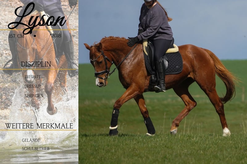Lyson ist eine 8 Jährige Stute ca. 157cm abstammend v. Anodin x Blue Bresil *Lyson* super schicke und sehr coole Allrounderin. Schön zu reiten in der Bahn mit 3 schönen soliden GGA. Im Gelände geht sie brav auch in fremder Umgebung. Straßenverkehr, Lärm, Baustellenfahrzeige, Planen usw. stellen kein Problem für sie da. Sie geht gerne ins Wasser und ist für jeden Spaß zu haben. Wir können uns Sie auch für einen Schulbetrieb oder ambitionierte Jugendliche vorstellen. !!! SCHAUEN SIE SICH UNBEDINGT IHR VIDEO AN !!! Im Umgang gut erzogen und unkompliziert. Ein Traumpferdchen mit der man viel Freude haben kann. Ein aktuelles Video finden Sie hier in der Anzeige oder unter folgendem Link: https://www.youtube.com/watch?v=06mbKUq5WeU Pferdehandlung Dederichs – Ihr Partner für den Pferdekauf Kontakt & Erreichbarkeit: Anfragen bitte ausschließlich telefonisch unter 0173/9792139 Montag – Freitag: 09:00 – 18:00 Uhr Samstag: 09:00 – 15:00 Uhr Sonntag: Ruhetag Folgen Sie uns auf Social Media! Erleben Sie unseren Alltag mit den Verkaufspferden auf Instagram, TikTok & Facebook unter Pferdehandlung Dederichs Rabatt: Bei sofortiger Mitnahme Ihres neuen Traumpferdes erhalten Sie zwischen 5 %– 10 % Rabatt Probereiten & Vorführen: • Probereiten: 40 € pro Pferd (max. 2 Reiter), Betrag wird beim Kauf angerechnet • Feiertage: Proberitt 50 € • Vorführung durch unsere Bereiter: 30 € pro Pferd (Vorreiten, Bodenarbeit etc.) Ankaufsuntersuchung & Transport: • Viele unserer Pferde besitzen bereits eine AKU • Sie können selbstverständlich Ihren eigenen Tierarzt mitbringen • Gerne organisieren wir eine Untersuchung • Wir unterstützen Sie auch gerne beim Transport ins neue Zuhause Weitere Verkaufspferde: In unserem Stall stehen weitere Verkaufspferde, die noch nicht online sind. Falls Ihr Traumpferd noch nicht dabei ist, zögern Sie nicht, uns zu kontaktieren. Wichtige Hinweise: • Stockmaß-Angaben sind geschätzt und nicht exakt nachgemessen • Alle Beschreibungen sind subjektive Einschätzungen des Verkäufers und keine zugesicherten Eigenschaften