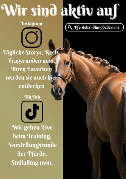 Catalina ist eine 8 Jährige Palomino Stute ca. 168cm *Catalina* ist ein one in a Million Pferd. Bildschön, rittig und gut ausgebildet, für jeden Spass zu haben. Catalina geht toll in der Bahn und bringt eine gute Ausbildung mit, sitzbequem mit schönen GGA ausgestattet. Sie geht alleine und in der Gruppe ins Gelände und das auch ohne Sattel. Mit ihr kann man jeden Spaß machen, ins Wasser reiten, ohne Sattel, auf Halsring reiten, über Baumstämme springen. Sie ist eine super Allrounderin mit tollem Charakter. Immer lieb, bereitet viel Freue und gibt einem ein sicheres Gefühl !!! SCHAUEN SIE SICH UNBEDINGT IHR VIDEO AN !!! Im Umgang auch ganz lieb und Menschenbezogen. Ein Pferd, welches man sich nicht entgehen lassen sollte. Ein aktuelles Video finden Sie hier in der Anzeige oder unter folgendem Link: https://www.youtube.com/watch?v=_Trd8w756Lo Pferdehandlung Dederichs – Ihr Partner für den Pferdekauf Kontakt & Erreichbarkeit: Anfragen bitte ausschließlich telefonisch unter 0173/9792139 Montag – Freitag: 09:00 – 18:00 Uhr Samstag: 09:00 – 15:00 Uhr Sonntag: Ruhetag Folgen Sie uns auf Social Media! Erleben Sie unseren Alltag mit den Verkaufspferden auf Instagram, TikTok & Facebook unter Pferdehandlung Dederichs Rabatt: Bei sofortiger Mitnahme Ihres neuen Traumpferdes erhalten Sie zwischen 5 %– 10 % Rabatt Probereiten & Vorführen: • Probereiten: 40 € pro Pferd (max. 2 Reiter), Betrag wird beim Kauf angerechnet • Feiertage: Proberitt 50 € • Vorführung durch unsere Bereiter: 30 € pro Pferd (Vorreiten, Bodenarbeit etc.) Ankaufsuntersuchung & Transport: • Viele unserer Pferde besitzen bereits eine AKU • Sie können selbstverständlich Ihren eigenen Tierarzt mitbringen • Gerne organisieren wir eine Untersuchung • Wir unterstützen Sie auch gerne beim Transport ins neue Zuhause Weitere Verkaufspferde: In unserem Stall stehen weitere Verkaufspferde, die noch nicht online sind. Falls Ihr Traumpferd noch nicht dabei ist, zögern Sie nicht, uns zu kontaktieren. Wichtige Hinweise: • Stockmaß-Angaben sind geschätzt und nicht exakt nachgemessen • Alle Beschreibungen sind subjektive Einschätzungen des Verkäufers und keine zugesicherten Eigenschaften