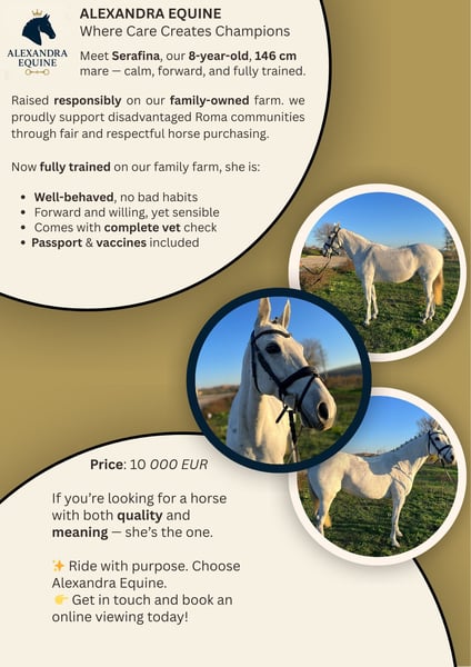 This is an exceptional, purebred Karakachan horse – a rare and ancient autochthonous breed from the mountains of Bulgaria. True to her heritage, this mare is a prime example of the breed’s legendary hardiness, intelligence, and sure-footedness. Characteristics & Temperament: She possesses a strong and steady character, combining self-assurance with a very loyal and cooperative work ethic. She is exceptionally brave and composed in challenging environments, making her a reliable partner. Endurance & Long-Distance Suitability: Built for the most demanding conditions, this breed is world-renowned for its extraordinary stamina. She is an ideal candidate for endurance riding or long-distance trail hacking, as her metabolism and bone density are optimized for sustained performance over rugged terrain. Level of Training & Abilities: - Professional Training: She is well-schooled in all three paces (walk, trot, canter), demonstrating balance and responsiveness. - Jumping: She is safe and confident over jumps, showing good focus and willingness for smaller competition classes or leisure show jumping. - Versatility: An elite choice for equestrian tourism, her inherent sure-footedness ensures safety across uneven landscapes. Social Impact: By choosing this horse, you are also supporting a meaningful social cause, as she was raised on a farm that proudly partners with disadvantaged Roma communities through fair and respectful horse purchasing practices. Further Characteristics: - Hardiness: An easy keeper with an excellent constitution and robust health. - Suitability: Perfect for an ambitious rider seeking a versatile, high-endurance mount with a unique history and social meaning.