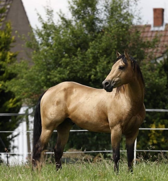 Our wonderful one-year-old Azteca mare from our own breeding is looking for a 5* home. Chexy impresses not only with her beauty but also with her wonderfully balanced and calm temperament. She is super brave, curious, and very interested in people. Additionally, she is completely unflappable and simply lovely to handle. Her curiosity and gentle nature make her an ideal future partner for all areas of recreational riding, Western classes, or Working Equitation. She has the potential to shine in many disciplines. Chexy is used to growing up in a herd, is well-socialized and mineralized. She is not familiar with box stalls and will not be placed there. Of course, she is farrier-friendly and loadable and already knows basic groundwork. We are looking for a person who will spend time with her and fully develop her potential. She will receive papers from AAHIA and of course has an equine passport. Key data: Breed: Azteca Gender: Mare Age: 1 year Color: Palomino Character: Calm, balanced, curious, unflappable Height: approx. 1.58 m The last two photos show the parents. Mother: PRE, Father: QH with old blood (Doc Chex)