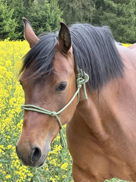 Suna ist die schmeichelndste Stute die ich kenne. Mit ihrem Charme und ihren lieben Augen zieht sich viele in ihren Bann. Suna ist 3 Jahre alt und bei uns geschlüpft. Es war ein atemberaubendes Erlebnis und ich schreibe diese Anzeige auch nicht gern. Wir lieben sie hier wirklich sehr aber wir können ihr zeitlich nicht gerecht werden. Sie braucht Kontakt zu jüngeren Pferden aber vor allem braucht sie Arbeit/ Beschäftigung im Sinne von regelmäßiger Bodenarbeit. Sie kennt schon etwas Horseman. Das Zirkeln im Roundpen, Weichen und Planenspiele mag sie. Hängertraining kennt sie auch etwas aber noch ungenügend. Wir kommen zu selten dazu. Suna ist noch roh, hätte jedoch einen Platz ab März zum Beritt bei Nina Gassner im savvy center. Was Suna noch braucht ist abgewogenes Futter, dies sollte in engmaschigen Netzen, in sogenannten Slowfeeder Netzen gereicht werden. Sie ist eben zur Hälfte ein PRE und kommt mit unseren fetten Wiesen und dem recht süß schmeckenden Heu gesundheitlich nicht zurecht. Wir hatten aus Nichtwissen aus diesem Grund extreme Probleme mit ihrer Gesundheit was wir jedoch durch Konsequenz gerade biegen konnten, eine Fressbremse ist aus diesem Grund auf der Wiese unerlässlich. Weiteres gern falls echtes Interesse besteht.
