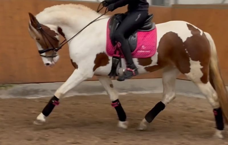 Vendo una encantadora y elegante yegua pinto de estilo barroco, ¡perfecta para toda la familia! Esta adorable yegua con un hermoso pelaje destaca por su carácter amistoso y su gran cercanía con las personas. En su entrenamiento muestra un buen nivel de doma y un fuerte deseo de complacer cada día. Es la compañera ideal para paseos variados y momentos de ocio relajados, ya que ya domina estas tareas con brillantez y transmite una sensación de seguridad. Es tranquila en la herrería y en el transporte, manejable y segura en terrenos irregulares. El precio aumentará con su progresión en la formación. Si está interesado o desea más información, no dude en contactarme. ¡Vale la pena conocerla! Con gusto puedo enviar videos a petición, en la pestaña correspondiente. La yegua se desplaza sin herraduras, tiene una excelente calidad de casco, está acostumbrada a niños y perros, y está completamente vacunada y desparasitada. Se pueden realizar un examen de salud (AKU) y radiografías en el lugar.