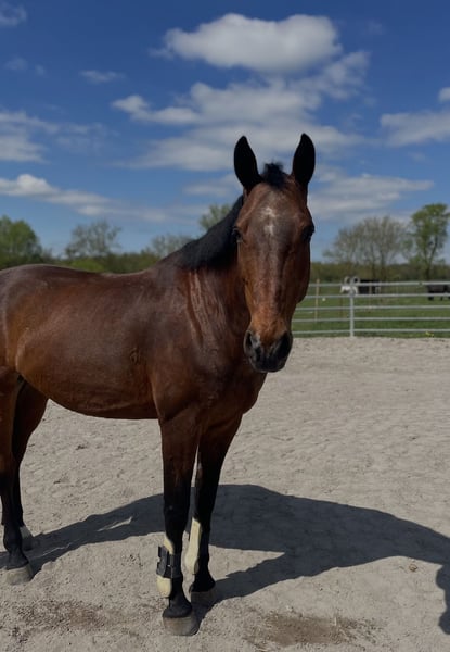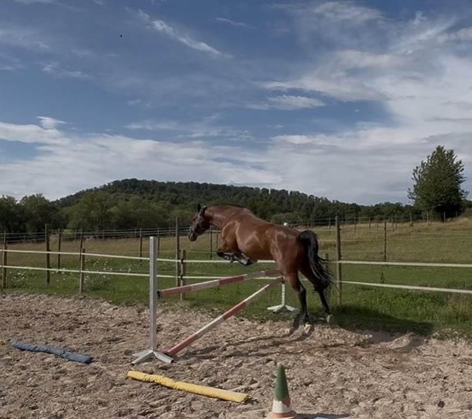 Dream horse ready to ride and have fun right away! This gelding wants to do everything right and simply makes every day enjoyable. Such a horse is rarely found on the market, priced accordingly to quality. He also comes from an excellent pedigree (Grannus on the dam’s side). I can easily imagine him as a first large horse for a pony beginner, especially if an adult rider would ride him once a week. He is familiar with lunging. Also suitable for a confident re-entrant rider. Very rideable, with a bit or bitless. Ready for jumping courses. Introduced to competitions up to A-level show jumping (most recently in 2023). Barefoot, uncomplicated at the blacksmith. Vaccinations up to date. Regularly seen by osteopath and dentist. He knows free jumping, ground work, lunging with a cavesson, cavaletti exercises, and works on the riding arena and in the indoor. He prefers to be turned out with a partner or with visual contact to others (also easygoing in a shared herd). He can go alone or in a group in the terrain. No bucking, no wrong steps. But he’s not a sleepwalker either. He thrives in the course but remains manageable at all times. He always jumps, adjusting himself if needed. Has never refused a jump! He can be groomed, ridden, and loved by children. ☺️ He also tolerates a break of 1-2 days without “exploding.” No bad habits, does not paw when tied, etc. Simply well-behaved and mentally clear. (He doesn’t like clipping much, should be lightly sedated for that.) He has never been seriously ill with me. Had one sarcoid on his ear, which was removed in 2023 and has not returned. Currently receives twice daily grain (oat-free), mineral supplement, and plenty of hay! AKU from the equine clinic from 2021 available. He is not offered for box stall housing. I want to see the stable beforehand. I reserve the right to repurchase. A fee of €25 will be charged for trial riding to prevent riding tourism. A new brand saddle (17“ jumping saddle from October 2025), fitted to him, can be purchased at an additional cost. He is being offered due to changed life circumstances. Not an emergency sale! (More details gladly in private.) Please only acquire a horse if you can afford it long-term (purchase price plus ongoing costs for at least 10 years). I wish for a home where he is worked with thoughtfully and lovingly, and where someone takes the time he deserves! No installment purchases, no leasing!