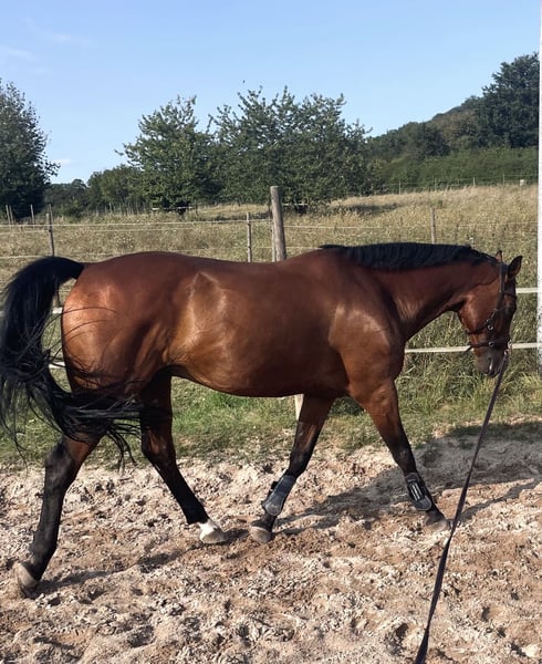 Traumkerl zum direkt losreiten und Spaß haben! Dieser Wallach will alles richtig machen. Und macht jeden Tag einfach Spaß. So ein Pferd findet man am Markt nicht oft, Preis der Qualität entsprechend. Dazu kommt eine tolle Abstammung. (Grannus auf Mutter Seite) Kann ihn mir super für eine Pony Umsteigerin als 1. Großpferd vorstellen, wenn ein Erwachsener ihn evtl 1x die Woche mit reitet. Kennt Ausbinder. Auch sicherer Wiedereinsteiger denkbar. Sehr rittig, mit Gebiss oder gebisslos. Parcoursfertig. Turnier bis A Springen vorgestellt. ( zuletzt 2023) Barhuf, unkompliziert beim Schmied. Impfungen sind aktuell. Ist regelmäßig bei Ostheo und Zahnarzt. Kennt Freispringen, Bodenarbeit, longieren mit Kappzaum, Cavaletti Arbeit, Platz und Halle. Auf Koppel geht er lieber mit Partner oder Sichtkontakt zu anderen. (Auch umgänglich in der gem. Herde) ins Gelände geht er allein oder in der Gruppe. Bockt nicht, macht keinen falschen Schritt. Ist aber auch keine Schlaftablette. Im Parcours blüht er auf, aber stets händelbar. Er springt immer, macht es sich zur Not passend. Hat noch nie geparkt! Lässt sich auch von Kindern putzen, reiten, Liebhaben ☺️ Verzeiht auch mal 1-2 Tage Pause ohne dass er „explodiert“. Keine Unarten, scharrt nicht beim anbinden etc. Einfach gut erzogen und kopfklar. (Scheren mag er nicht so, sollte hier leicht sediert werden) War bei mir nie ernsthaft krank. Hatte 1 Sarkoid am Ohr, welches 2023 entfernt wurde und nie wiederkam. Bekommt hier aktuell 2x / pro Tag Kraftfutter (haferfrei) und Mineralfutter und viel Heu! AKU von Pferdeklinik aus 2021 liegt vor. Wird nicht in Boxenhaltung abgegeben. Ich möchte mir den Stall vorher 1x ansehen. Rückkaufrecht behalte ich mir ebenfalls vor. Für das probereiten wird eine Aufwandsgebühr von 25€ erhoben um Reittourrismus zu vermeiden. Ein neuer Markensattel (Springsattel 17“) aus Oktober 2025, der an ihn angepasst ist, kann gegen Aufpreis mit erworben werden. Aufgrund geänderter Lebnsumstände abzugeben. Kein Notverkauf! (Mehr dazu gern privat) Bitte nur ein Pferd zulegen wenn man es sich auch langfristig leisten kann. (Kaufpreis plus laufende Kosten für mind. 10 Jahre) Wünsche mir ein Zuhause wo man mit Verstand und Liebe mit ihm arbeitet und sich die Zeit für ihn nimmt die er verdient! Kein Ratenkauf, kein zur Verfügung!