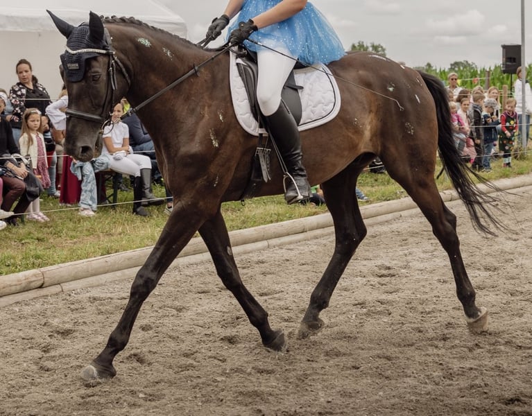 Dino to 14-letni wałach bawarski koń w typie warmblood. Z powodu braku czasu, z którym nie mogę sobie już poradzić, chciałbym oddać Dino w dobre ręce. Dino ma wysokość w kłębie około 1,78 m, co sprawia, że dobrze pasuje do wysokich jeźdźców. Jest bardzo wrażliwy i na początku potrzebuje dużo czasu, aby przyzwyczaić się do nowych osób, nie wykazuje jednak żadnych złych nawyków, poza zwykłym testowaniem i niepewnością w nieznanych sytuacjach. Gdy zyska zaufanie, jest dobrym partnerem i towarzyszy z oddaniem. Ma silny charakter i wymaga konsekwentnego wychowania, dlatego nie nadaje się dla początkujących. Był jeżdżony rekreacyjnie, z naciskiem na pracę w ujeżdżeniu, ale małe skoki i jazda w terenie z innymi końmi nie stanowią problemu. Dino nie wykazuje takich złych nawyków jak brykanie, stawanie na tylnych nogach czy kopanie. Obecnie przebywa w boksie, z codziennym wypuszczaniem na pastwisko lub paddock razem z klaczą. W razie dalszych pytań proszę pisać. Nie jest to sprzedaż w nagłej potrzebie, oddaję tylko w odpowiednie ręce!