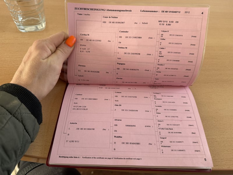 We are offering here a 13-year-old mare that is truly incredibly easy to handle. She is very well-behaved, rather relaxed, and therefore ideal for reiners, leisure riders, or as a perfect girl’s horse. She is not overly spirited, tends to be laid-back, and makes it easy to feel comfortable and confident riding her. Her pedigree is of course available and can be sent upon request (as seen in the photo). If you are looking for a reliable, relaxed, and genuinely lovable partner who is perfect for leisure riding and a gentle start into riding, you will find her here. To avoid re-travel costs, we charge €50, which will be deducted from the purchase price, of course!