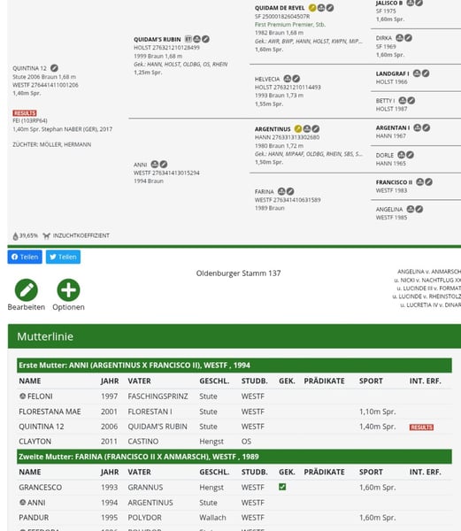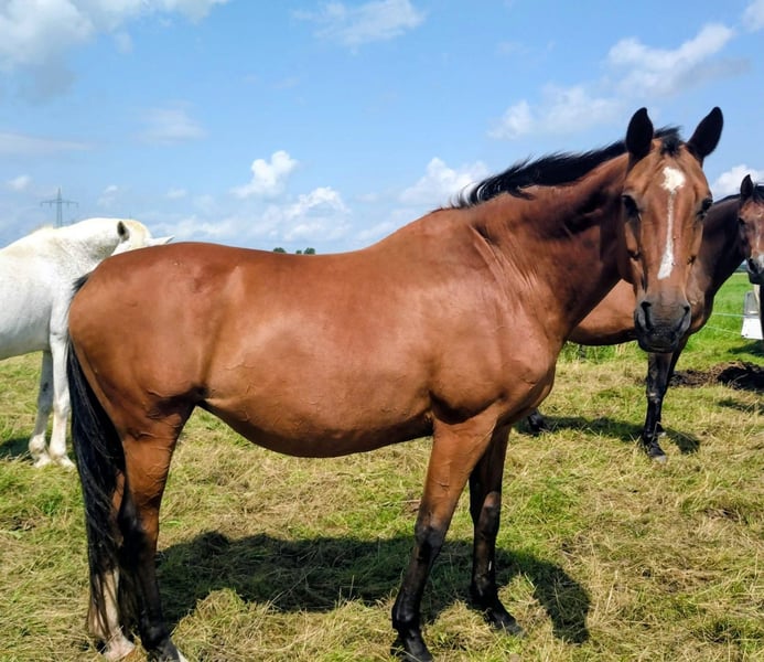 Meine bis S** platzierte Stute Quintina sucht ein neues zu Hause. Sie im Jahr 2006 geboren und ca 168 groß. Ihr Vater ist Quidams Rubin und ihre Mutter eine Stute von Argentinus - Francisco II ( Abstammung siehe Bilder) Ihr Mutter ist die Schwester zu den 160 erfolgreichen Pferde. Pandur 292 und Grancesco ( auch gekört) Sie ist fit und wurde in der letzten Zeit als Zuchtstute genutzt. Sie ist werder krank noch verletzt aus dem Sport gegangen. Sie ist reitbar, zur Zeit nur sporadisch freizeitmäßig geritten. Sie kennt Ausreiten und. auf dem Platz reiten. Quintina ist immer brav , freundlich und einfach bei Reiten, sowie im Umgang Die Stute ist nicht tragend und kommt aus einem sehr erfolgreichen Stamm. Daher könnte sie vielleicht auch noch 1-2 Fohlen bekommen