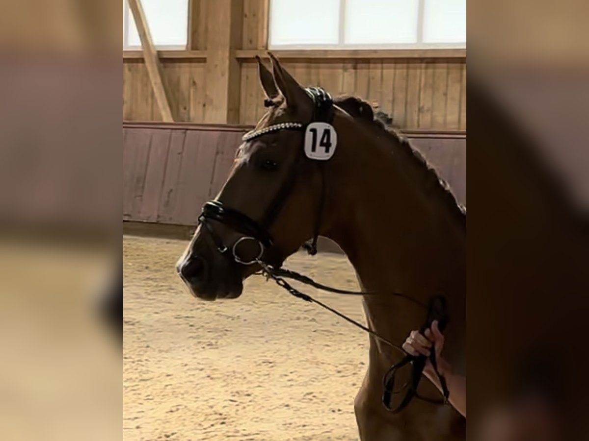 Due to a change in her competition schedule, I am offering this elegant chestnut mare to a caring rider. She is far too good to just stand around. The Borsalino daughter has three very good basic gaits and an excellent work ethic. Her expressive trot is comfortable to sit, and she has no issues with collection in canter. She has foaled before and has not yet been presented in-hand at a show. She is well-behaved in the field. A recent veterinary certificate is available.
