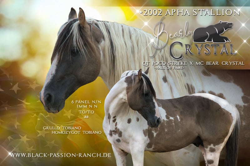 ATTENTION ! TG ONLY ! I imported our Bear from Oklahoma / USA in 2010. He has all the Paints in him that have ever been successful. His full brothers have been successful in rows. He has always inherited colorful and is 7 panel N/N tested !!! In terms of character and riding he was a TREASURE. Anyone could ride him, even the children. Bear has not been alive since 2023. But .... there is still TG semen from him that can be sent to selected mares. Please ask us. 01731845588 BEAR IS A FULL BROTHER TO: 2 WORLD CHAMPIONS, 5 NRHA MONEY EARNERS, MULTIPLE SUPERIORS, AND MANY MANY ROM'S. HIS FULL SIBLINGS HAVE EARNED OVER 500 APHA POINTS, IN REINING, WORKING COW HORSE, WORKING RANCH HORSE, AS WELL AS AMATEUR AND YOUTH SUPERIORS QTS CLEARCRYSTAL BEAR His son: Bears Q Ton Poco Q Ton of Gold His son: QTsGold Mastercard As a bonus there is a speciale: ⭐️ 100% Always Colored / Tobiano ! ⭐️ Grullo / Black Tobiano !