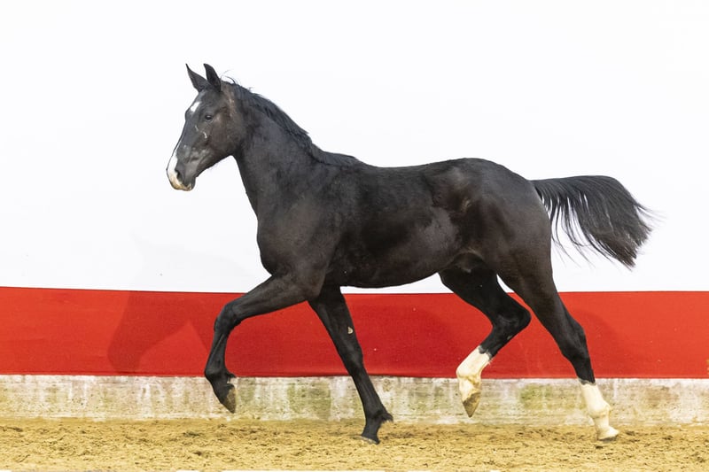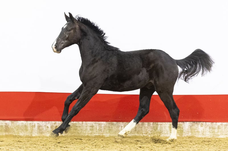 In his first loose jumps he already shows plenty of scope. What stands out immediately is his exceptional hind leg technique. He is eager to do his best and jumps with commitment and conviction. He moves easily, with an active hind leg and a good, big canter stride. Light-footed for his size and naturally well balanced. A young horse with power, attitude and serious future potential.