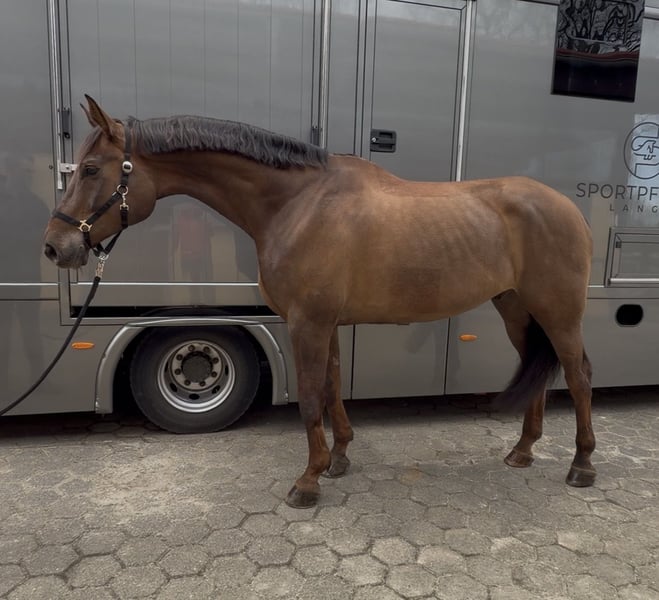For sale is the exceptional 8-year-old gelding Armigo, sired by Armison out of Chambertin. This tall, dark chestnut with a height of approximately 188 cm combines an impressive appearance with sporting enthusiasm and unlimited jumping talent. Armigo has a solid and successful show jumping education. He has already won jumping competitions at the M level and has placed several times in M**-class events, demonstrating his quality and consistency in the arena. In daily handling, Armigo is pleasant and straightforward. Under saddle, he offers confidence, making him suitable for experienced children riders. Due to his size, talent, and sporting potential, he is not a beginner’s horse and should be ridden by a rider with sensitivity and experience to develop his full potential. He is ideal for ambitious riders seeking a motivated and promising show jumper—whether for further competition or targeted development in advanced show jumping. Further information, videos, and a test ride are available at any time for serious inquiries.