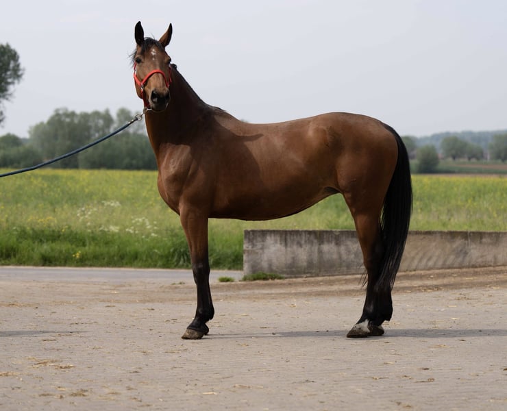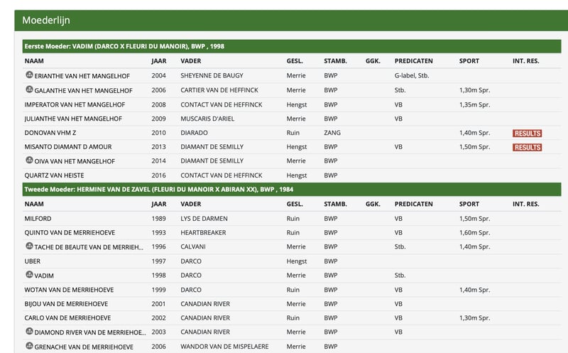 Mare Diamant x Darco. Mare is full sister to Misanto Diamant d'Amour, who successfully jumped 1.55m with Jens Wawrauschek and then joined the stables of Marcus Ehning. Furthermore, she is a sister of Donovan VHM Z (1.40m sj), Imperator van het Mangelhof (1.35m) and Galanthe van het Mangelhof (1.30m). In 2nd line, sport horses can be found such as Milford (1.50m sj), Quinto van de Merriehoeve (1.60m sj), Tache de Beauté van de Merriehoeve (1.40m sj), Wotan van de Merriehoeve (1.40m sj), Carlo van de Merriehoeve (1.30m),... The mare herself is trained, but not ridden on. She has already given birth to 3 foals (Eldorado vd zeshoek, Verdi and Vagabond de la pomme).