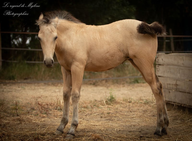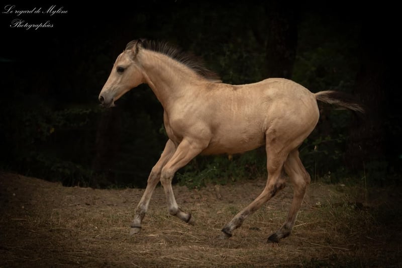 Olympe has found her family, and now it’s the turn of the charismatic Pluie d’Étoiles to find hers! Pluie d’Étoiles is a stunning, full-blooded crème-colored foal with a chocolate coat, born on May 4, 2025. Mother: Calanne des Dieux, a full-blooded, crème-colored, smoky bay mare with PRE origins. Father: Ice Dream One, a full-blooded quarter horse stallion with a cremello coat, approved for breeding, with crème-colored lineage. Expected height around 1.55–1.60 m. Curious, very affectionate, and human-oriented. Calm temperament with just the right amount of blood. Will be a versatile mare suitable for all disciplines: working equitation, flat riding, outdoor riding, TREC, Equifeel, Western, mountain trail, eventing, and even breeding, given her pedigree. Late, gradual weaning planned for early January 2026 (at 8 months), possibly February 2026. Herd-kept. Vaccinated, chipped, dewormed, and under veterinary care. Well-trained and familiar with age-appropriate groundwork (halter-trained, leads, gives feet, lunges). Can be seen with her mother near Toulouse. Transport available upon request. Price: €5,000 including VAT (reservation deposit of €1,000; the remaining balance can be paid in installments until weaning).