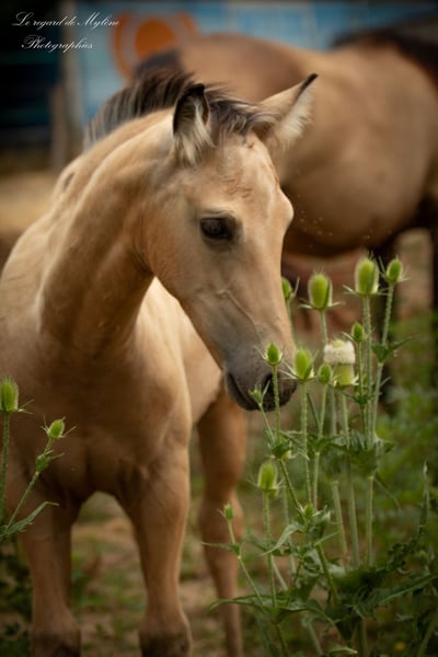 Olympe ayant trouvé sa famille, c'est au tour de la charismatique Pluie d'Etoiles de rechercher la sienne! Pluie d'Etoiles, sublime pouliche pleins papiers race crème robe isabelle née le 4 mai 2025. Mère Calanne des Dieux race crème pleins papiers robe isabelle fumée origines PRE. Père Ice Dream One race quarter horse pleins papiers robe cremello agréé facteur race crème. Toisera autour d'1m55-1m60. Curieuse, très attachante, proche de l'homme. Mental posé avec juste ce qu'il faut de sang. Sera une jument polyvalente pour toute discipline : équitation de travail, plat, extérieur, trec, equifeel, western, mountain trail, CCE, et même reproduction compte-tenu de ses papiers. Sevrage tardif progressif prévu début janvier 2026 (8 mois) voire février 2026. Vit en troupeau. Complémentée, pucée, vermifugée, suivie en parage. Elle est éduquée et maîtrise les apprentissages cohérents avec son âge (licolée, donne les pieds, marche en main ). Visible avec sa maman sur Toulouse. Transport possible sur devis. 5000€ TTC (acompte de réservation de 1000€ ; le solde pouvant être échelonné jusqu'au sevrage).
