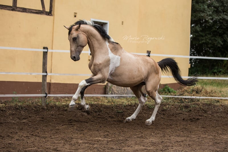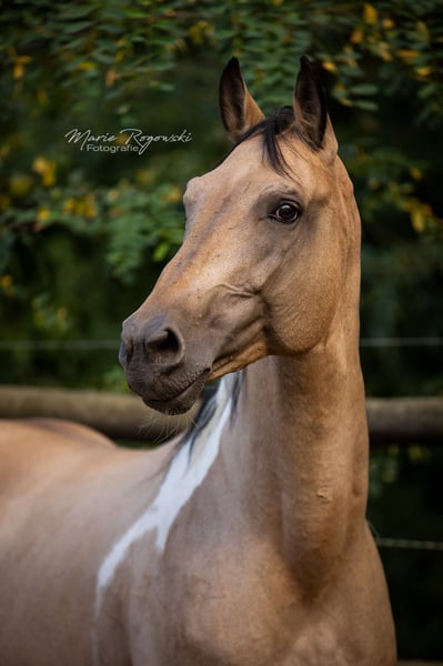 Caballo de doma alemán | Tobiano buckskin | 2007 | aproximadamente 1,70 m Aprobado por VZAP, AES, ECHA-ESV, ZfdP | Prueba de rendimiento de semental realizada (VZAP HLP 2014 - Nota 7.0) Registrado en Zangersheide y IFCE Francia Genética del color: Ee Aa Cr/n TO/n Testado genéticamente: SCID, CA, WFFS y PSSM2 - negativo Talisman GF es un semental de hermoso aspecto, bien conformado, con un llamativo color especial y ascendencia deportiva. Destaca por sus movimientos básicos de buen carácter, una disposición tranquila y una estructura armónica. En el día a día, Talisman se muestra equilibrado, confiable y atento. Vive en paddock abierto, es fácil de manejar, tiene experiencia en monta y está familiarizado con todos los procedimientos en la yeguada. Su pedigrí combina sangre deportiva sin líneas de Samber, Ico ni Camaro. El padre, Taarlon (caballo de élite, salto M), desciende de Rigoletto (Ramzes AA), y la madre, Morgenlicht GF, proviene de Morgengold II y Wilderer, de una línea con rendimiento probado, color, fundamento y buen carácter para la doma. Es padre de dos sementales aprobados: Traumprinz GF (Australia) y Tagtraum Falkenhorst Z (Alemania/Francia), además de varios ejemplares con éxito deportivo y en la cría en Europa y Suiza.