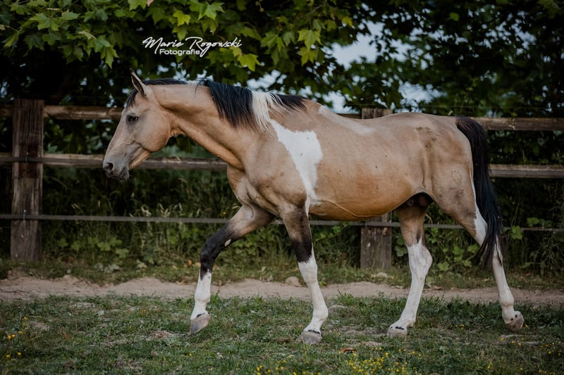 German riding horse | Buckskin Tobiano | 2007 | approx. 170 cm Approved by VZAP, AES, ECHA-ESV, ZfdP | Stallion performance test completed (VZAP HLP 2014 – score 7.0) Registered with Zangersheide and IFCE France Colour genetics: Ee Aa Cr/n TO/n Genetically tested: SCID, CA, WFFS and PSSM2 - negative Talisman GF is a beautifully shaped, correctly built stallion with a striking special colour and athletic pedigree. He impresses with his rideable gaits, calm temperament and harmonious physique. In daily handling, Talisman is balanced, reliable and attentive. He lives in an open stable, is easy to handle, experienced in covering mares and familiar with all the routines of everyday life at the stud. His pedigree combines athletic bloodlines without Samber, Ico or Camaro lines. His sire Taarlon (elite stallion, M-level show jumping) goes back to Rigoletto (Ramzes AA), while his dam Morgenlicht GF comes from a performance-tested line with colour, conformation and rideability via Morgengold II and Wilderer. He is the sire of two licensed stallions – Traumprinz GF (Australia) and Tagtraum Falkenhorst Z (Germany/France) – as well as several successful offspring in sport and breeding in Europe and Switzerland.