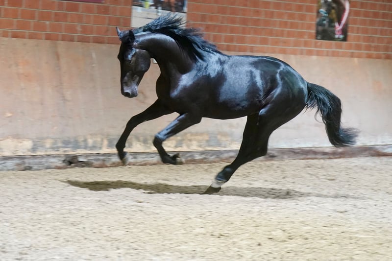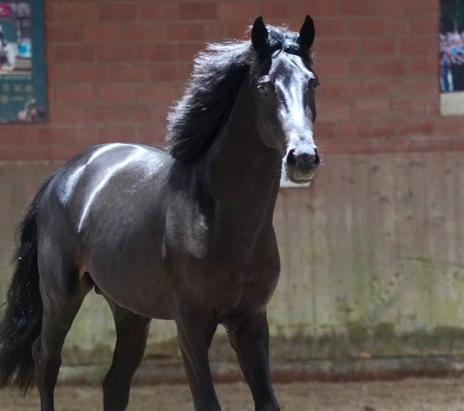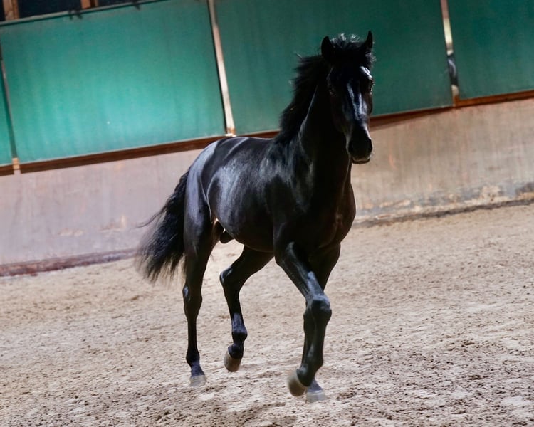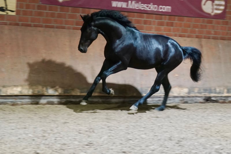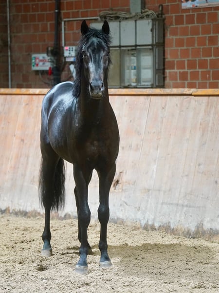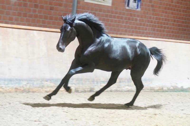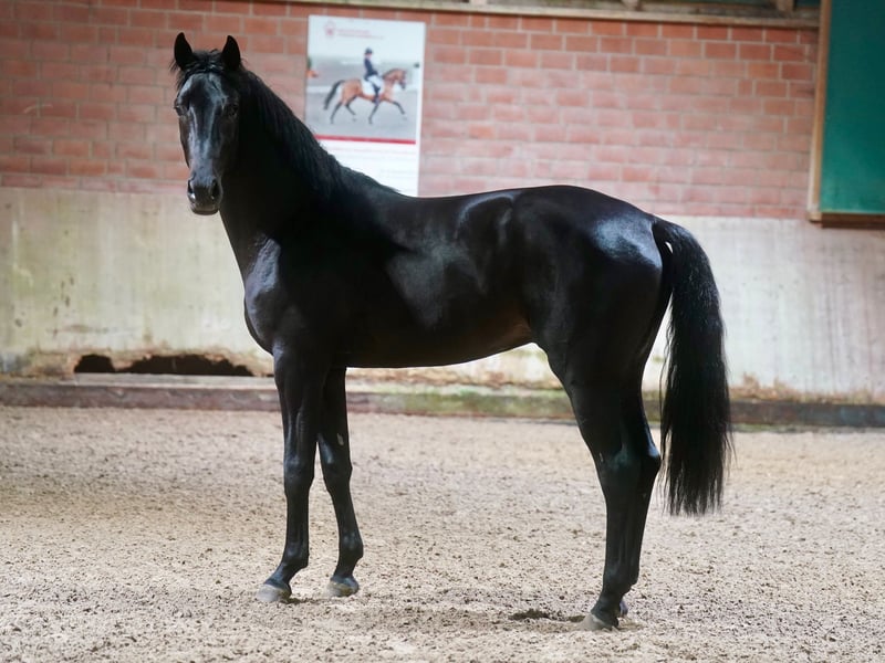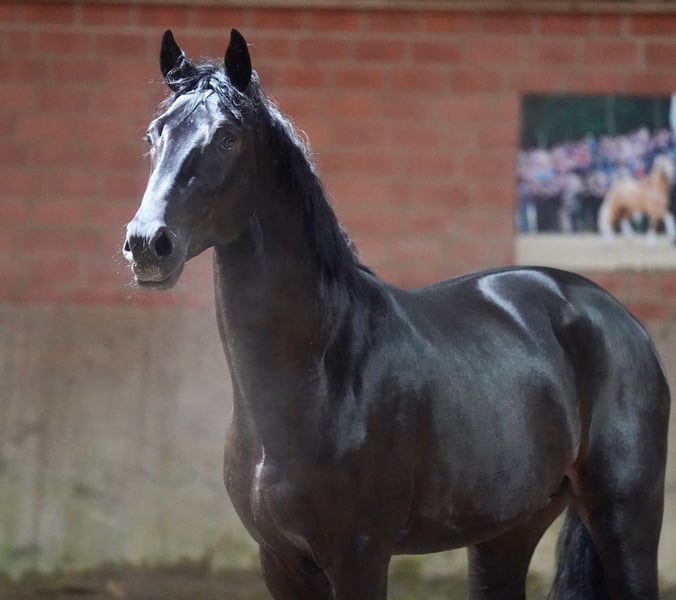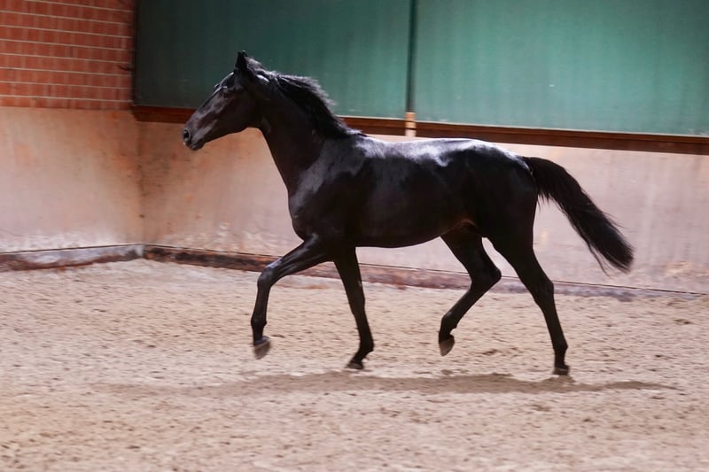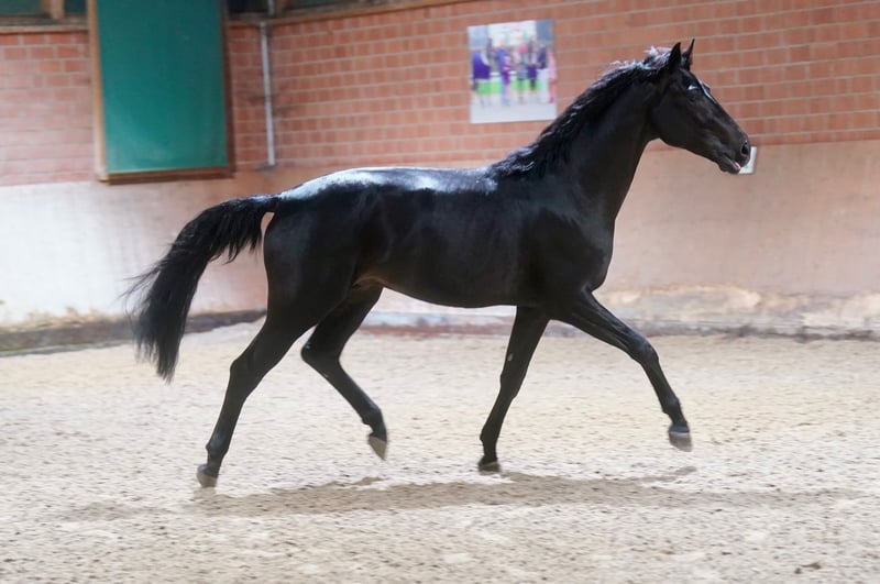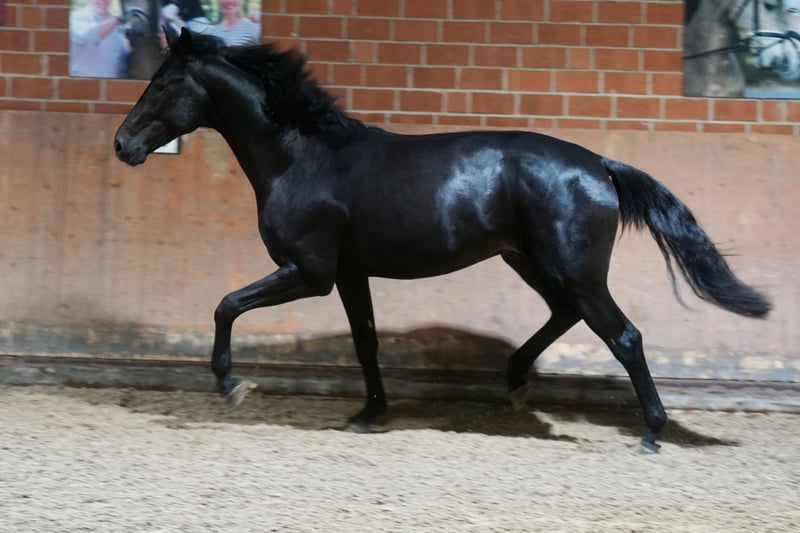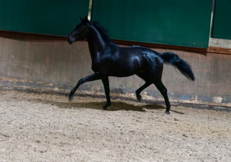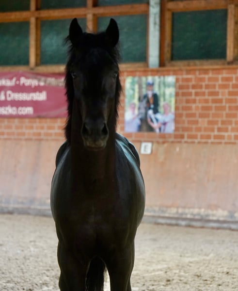 Zum Verkauf steht ein vielversprechender Deutsches Reitpferd Hengst, geboren im Jahr 2023. **Merkmale:** - **Rasse:** Deutsches Reitpferd - **Geschlecht:** Hengst - **Farbe:** Rappe - **Stockmaß:** 166 cm - **Eignung:** Dressur Dieser elegante Hengst besticht durch sein ansprechendes Exterieur und seine hervorragenden Bewegungen. Er zeigt bereits viel Potenzial für die Dressur und ist sowohl für den ambitionierten Reiter als auch für den professionellen Sport geeignet. Der Hengst ist gut erzogen, freundlich im Umgang und zeigt eine hohe Lernbereitschaft. Er hat eine positive Einstellung zur Arbeit und ist bereit, mit seinem zukünftigen Reiter zu wachsen. Er ist quasi der 3/4 - Bruder des Milionenhengstes Dynamic Dream