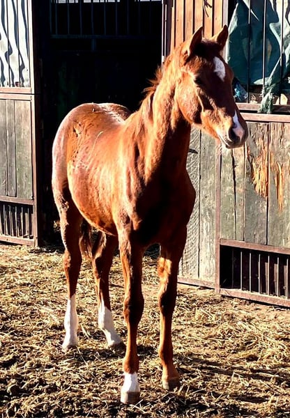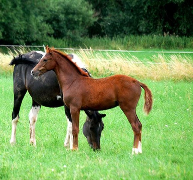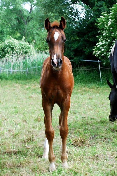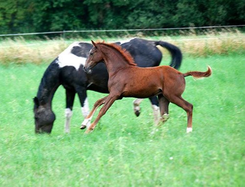 Cello C (geb. 11.04.2025), ein langbeiniger, bildschöner, sich auch sehr gut und leichtfüßig bewegender, pfiffiger Jährlingshengst (Fohlenprämie!) - Endmaß ca. 169 cm - mit 3 weißen Söckchen und schöner Zeichnung im Gesicht. Sein Vater ist der im Springsport hocherfolgreiche Rapphengst Central Park (Casall x Contender, Station Maas-Hell), der in seinem Pedigree top Springer vereint und mütterlicherseits auf die gekörten Vollbrüder Chello I-III zurückgeht. Mutter dieses Nachwuchskrachers ist unsere typvolle, doppelt veranlagte Prämienstute Sissy C (Samenco K x Camaro, Lehar, Ladykiller xx). Sie brachte mit Ludwig´s As bereits einen bunten Sohn, der sich 5-jährig unter den 20 besten Springpferden in Belgien behaupten konnte und dort begeistert weiter gefördert wird. Cello C ist charakterlich cool und aufgeschlossen, lernt super schnell, zeigt jetzt schon, daß er springen will und kann, wegen seines interessanten Blutanschlusses auch für die Vielseitigkeit und die Zucht interessant. Ein Traumtyp und künftiger Sport- oder Freizeitpartner mit allerbesten Anlagen. Nur in liebevolle, gern fördernde Hände. Mehr Infos auf www.sportschecken.de oder unter 0177/8140272. Absetzen ist ab sofort möglich, derzeit genießt er aber noch seine gemeinsame Zeit mit Mama.