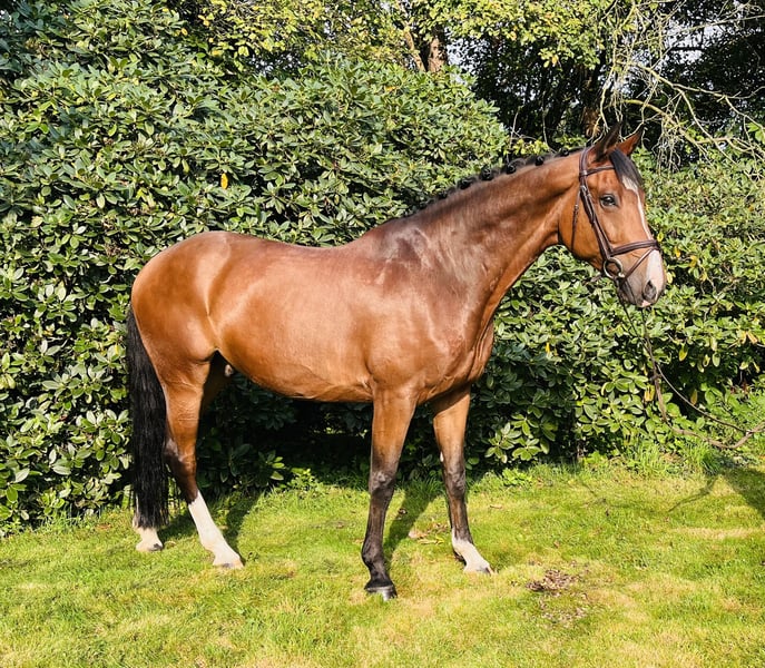 We are looking for a nice home for our Crysou (S: Comme il faut MV: Godolphin) He was born with us, was gently broken in at the age of 4 and has competed in show jumping up to elementary (L) level. Crysou is about 1.70 m tall. Particularly noteworthy is his exceptional sitting comfort in all 3 gaits! Crysou prefers to be ridden with fine aids and is always eager to please his rider. He is a pleasure to handle every day, whether in dressage, jumping or on rides. He is naturally fond of blacksmithing and loading and knows dogs, tractors and trucks. Crysou is compatible and friendly with other horses and loves to be petted by his humans. We would like a loving home for him, preferably with a family connection.