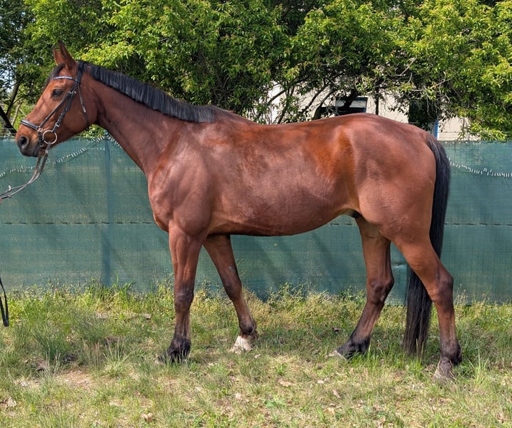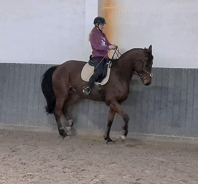 Bild von den ersten halben Tritten Alvaro ist ein Leistungsbereiter 8 Jähriger Wallach. Er möchte seinem Reiter immer Gefallen und bereitet sehr viel Freude. Er besitzt 3 gute Grundgangarten und macht auch einen guten Sprung. Er ist ein im Blut stehender ca. 1,75m großer Wallach. Dabei aber super fein zu reiten, leicht an allen Hilfen und immer daran interessiert zu verstehen, was der Reiter von ihm möchte. Sicher auch für die Vielseitigkeit interessant, bei uns aber nicht weiter gefördert. Bisher nur eine Saison gelaufen aufgrund von Ausfall des Reiters. Dabei wurde er nur in Springprüfungen der Klasse A vorgestellt. Aktuell meistert er alle Anforderungen der Klasse L in Dressur und Springen mit Bravour. Läuft sowohl auf Gummistange, als auch auf Wassertrense oder Kandarre, immer fein am Zügel. Sehr hohe Versammlungsbereitschaft vor allem im Galopp. (Fliegende Wechsel begonnen, Galopp Pirouetten begonnen, Pi/Pa begonnen) Alle Starken Gangarten lassen sich bereits gut herausreiten. Mit etwas Feinschliff bei den fliegenden Wechseln wird er in Kürze in der Klasse M einsatzbereit sein. Springen bis 120cm im Training ohne Probleme. Im Freispringen gibt es kaum Grenzen. Getüvt ist er aktuell noch nicht.