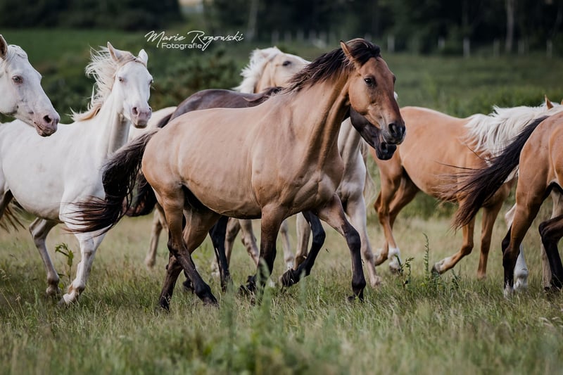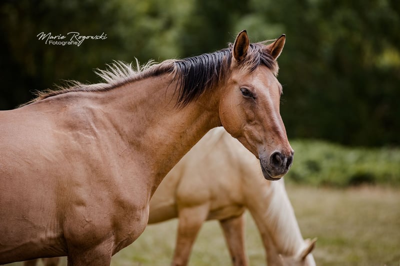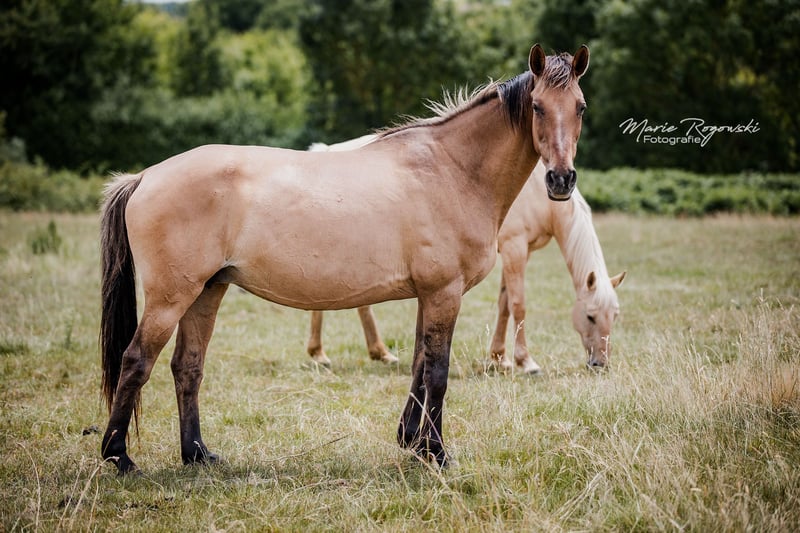 FUNNY GIRL is currently the only broodmare worldwide with a full warmblood pedigree in brown coat colour with DUN lightening, which did not come from Western horse breeds or Spanish blood, but can be traced back to proven mating in Germany in 1985 and has been carefully bred. At the renowned Trakehner stud farm in Merzdorf, the licensed Norwegian Fjord horse stallion Emil *1972 covered the English thoroughbred mare Feinsliebchen, who was registered in the main stud book of German Trakehner breeding. The Trakehner Association and later the ZfDP recognised this and the filly qualified for the main stud book. This is Funny Girl's grandmother. The DUN gene continues to be passed on very successfully through the dam line to this day. The stud book extracts were renewed in 2024 by the participating breeding associations in Germany. The mare came to us as a two-year-old filly via an auction in 2011. Since then, she has lived in the large broodmare herd, and since 2020 in France. To date, she has had six healthy foals, both through natural mating and insemination. In 2014, the palomino colt PALADIN GOLD GF (ZfDP), who lives in England. In 2015, the filly FABULA GF (AES), the first DUNALINO mare born worldwide with full papers, now herself a broodmare in our herd. Both are by the world's first thoroughbred in smokey-cream TCF PALLADIUM xx (CAN), who is stationed with us. In 2016, the black colt ROCHER NOIR GF by Rodrigoo VDL – proven Holstein show jumping lines. In 2018, the bay DUN colt FABELKÖNIG FALKENHORST Z by Fürst Wilhelm. This incredible Zangersheide-branded stallion has now been approved. 2020: the black filly MIDNIGHT Z by Mykonos (Millenium). 2022: the bay DUN filly LADY IN DUN Z by our frame-overo thoroughbred Letter of Marque xx (USA). She is always an exemplary mother and a confident member of the herd, unobtrusive in her manner. Due to the dissolution of the herd, this unique mare, which qualifies this colour variation for international sport horse breeding, is being sold. Recognition as explained above: ZfDP, AES, Zangersheide. Additionally, 2022 IFCE France entry broodmare (Stud-book de reproduction: FACTEUR DE SELLE FRANCAIS). DNA card available. Colour gene test AA.