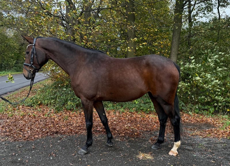 For sale is a stylish bay mare with an approximate height of 16.1 hh. She is by Louis Le Bon (by Lancer II) out of an Arpeggio mare, combining proven jumping and performance bloodlines in her pedigree. The mare has been with us for nearly two months, during which she has been gently backed and consistently shows herself to be well-behaved, curious, and cooperative under saddle. She is also uncomplicated and friendly in daily handling. She has three beautiful, rhythmical basic gaits. She has not yet been able to be free-jumped at our facility due to lack of suitable facilities, but she has calmly and bravely cleared small jumps under saddle. For her further training, we wish her a loving new home where she can develop her potential—whether in leisure riding or with prospects for sport. She has all the qualities to grow into a wonderful partner with the right guidance.