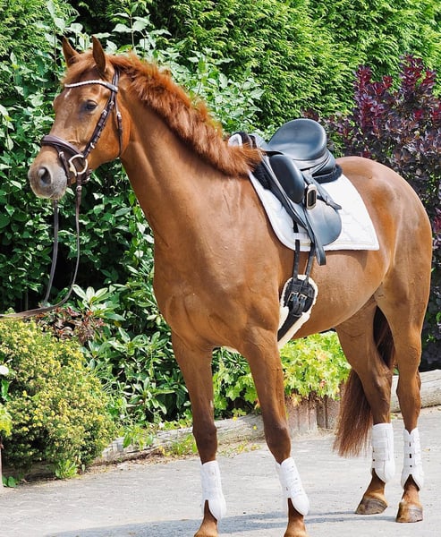 For sale: Elegant Chestnut Riding Horse We are offering a beautiful chestnut mare, born in 2021. With her charming personality and friendly nature, she is a true asset for any rider. The mare stands at 164 cm (16.1 hh) and is ideally suited for dressage. She demonstrates great talent and willingness to learn, is well-trained, and impresses with her elegant appearance and calm demeanor. TÜV: No issues reported If you are interested or have further questions, please feel free to contact me. Viewings and test rides can be arranged by appointment.