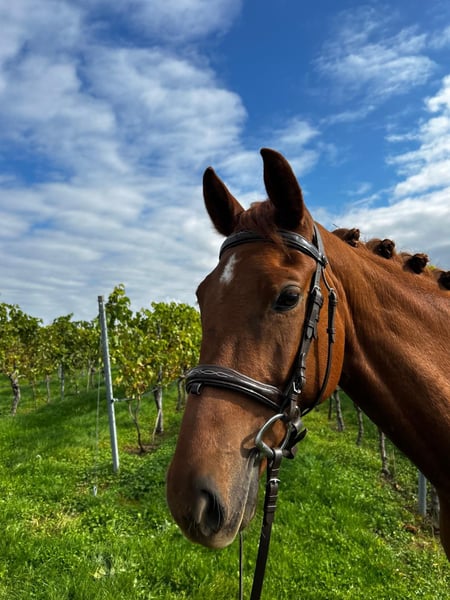 Se ofrece a la venta una yegua castaña de 5 años con un carácter excepcional y movimientos excelentes. Demuestra ser tranquila y fácil de montar tanto en el día a día como bajo la silla, además de ser fuerte de nervios y apta para amateurs. Ya sea en entornos nuevos o en el campo, siempre se mantiene calmada y sencilla de manejar. Desde principios de este año, ha sido montada y también muestra talento para los saltos. Ya tuvo una cría muy típica de Finch Hatton, que se presenta moderna y con movimientos enérgicos. Por ello, es interesante tanto para su futura formación deportiva como como futura yegua de cría.