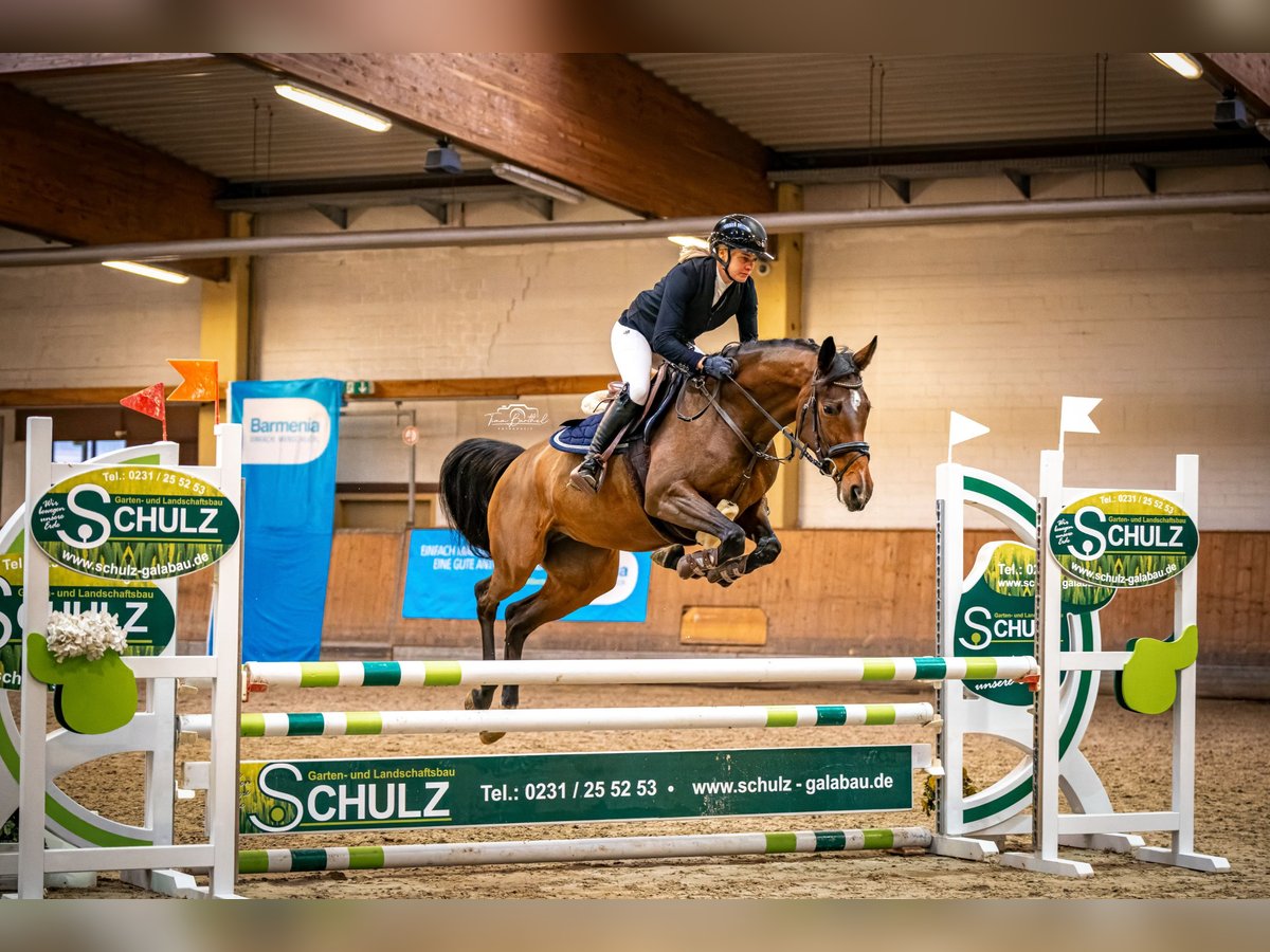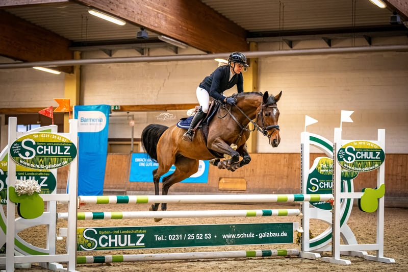Zum Verkauf steht eine 6-jährige hoch im Blut stehende, braune Stute aus eigener Zucht. Sie hat ein aktuelles Stockmaß von ca. 164 cm. Diese Stute konnte bereits im Herbst 2024 erste Turniererfahrung sammeln und sich in Springpferde A platzieren. Sie zeigt sich stets brav und zuverlässig – egal ob in der Halle, am Platz oder im Gelände. Diese junge Stute springt gerne und hat Go. Erste Erfahrung mit Amateurin auf der Geländestrecke sowie einem Orientierungsritt meisterte sie brav. Im Umgang ist sie freundlich, unkompliziert und sehr brav – sowohl beim Schmied als auch beim Verladen oder in der Herde. Im letzten Jahr wurde sie von einer junge Amateurin stallintern mitgeritten, daher keine Turniervorstellung 2025. Sie ist natürlich regelmäßig geimpft, entwurmt und dem Schmied vorgestellt worden. Es ist kein TÜV vorhanden, dieser kann aber auf Wunsch gemacht werden. Eine interessante Stute für Springen, Vielseitigkeit oder Freizeit. Wir wünschen uns für diese junge Stute ein 5* Zuhause mit genügend Bespaßung sowie entsprechender Förderung. Bei Interesse am besten anrufen oder WhatsApp unter 0171-4239087. Weitere Infos gerne im persönlichen Gespräch.