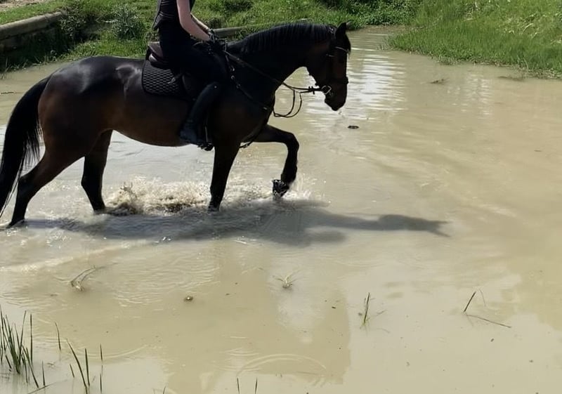 Due to a medical condition, I am unfortunately seeking a new, permanent home for my dream mare that fully meets her needs. Bella Vista is looking for a home with plenty of turnout, sufficient exercise, and lots of cuddles, but without ambitions for jumping or competition. Bella has a heart of gold! She is initially somewhat cautious with people, but once she trusts you, she will do almost anything for you. I purchased Bella directly from the breeder in 2023. So far, her training has primarily focused on basic groundwork with an emphasis on dressage. She still requires further training, especially in achieving correct straightness. She has regularly participated in jumping lessons and has gained some experience in eventing. Unfortunately, Bella has bilateral osteoarthritis (spat) in her hocks, so jumping should be avoided in the future. The condition was treated in December 2025, and the treatments have responded well. She is now back in training after her initial retraining and shows a motivated work attitude every day. She is very suitable for recreational riding and likely has no restrictions in this regard. In the field, she behaves very well both alone and in a group, making her a truly reliable partner. Since Bella has a good amount of drive, she is not suitable for complete beginners. Bella will only be placed in the very best hands! This is not a desperate sale. Multiple meetings are possible and encouraged. SO, DEFINITELY PLACE BEFORE PRICE! She is very easygoing with other horses and tends to be lower in the herd hierarchy. She has had various paddock mates with whom she got along perfectly. She was last vaccinated and dewormed in December 2025, and her teeth were recently floated in December. Current X-rays of her spat (12/2025), as well as AKU images from October 2023, are available. A consultation with her treating veterinarian can be arranged. All equipment, including a Stubben spring saddle and a Cobra dressage saddle, can be purchased together with her. For more information, please contact: 0151 70039649