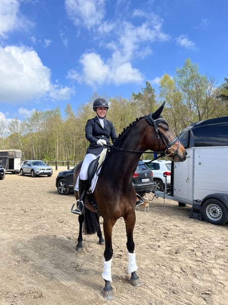 The Kennedy We are searching for the very best home for our mare, "The Kennedy." She is a homebred mare (Don Kennedy x Fürst Heinrich x Deniro), 9 years old, stunning, dark brown, approximately 16.1 hh. I gently backed Kennedy in 2020/2021, and at four years old, she already experienced her first competitions and brought home some placings. At five, we achieved wins and placements in class A. At six and seven years old, we competed successfully in class L. Besides dressage work, Kennedy enjoys long hacks, her daily turnout, and playful small jumps for gymnastics. She is an absolute sweetheart in handling and remains calm and focused at competitions, always with a lot of joy. She loves variety and is open to any fun activity. Since Kennedy has been a family member from birth, we are looking for a 5-star home for her. She is a perfect horse for transitioning from ponies. Her training level is limited to class L. She performs good traversals, but flying changes are challenging for her. We want to keep riding her with enjoyment and avoid overloading her with more difficult tasks. For us, fun and animal welfare are paramount. If you feel addressed, please don’t hesitate to contact me. I am happy to share more information personally. I have countless videos and photos available. Best regards, Laura