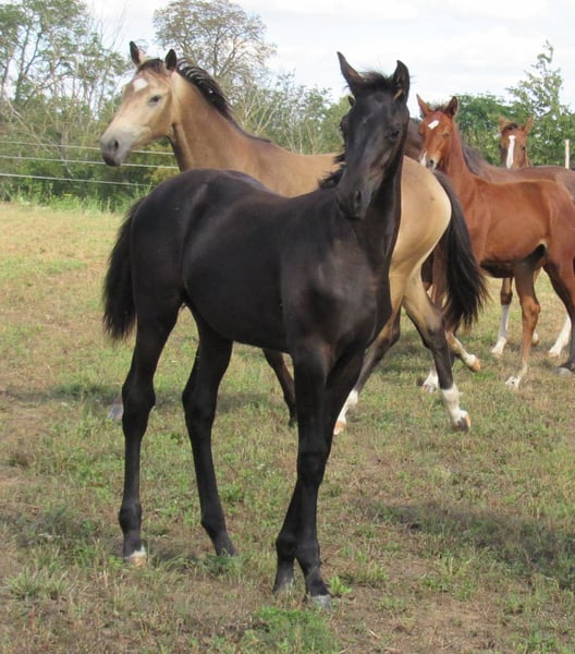 Nous vendons un très élégant poulain noir, fils du hongre Trakehner Ivanhoe (Élevage Hörem). D'une beauté typique incroyable et doté de très bonnes allures fondamentales, il est certainement intéressant pour les éleveurs de hongres. Nos juments d'élevage se distinguent toutes par un caractère très amical et désireux d'apprendre, ce qui nous permet d'attendre la même chose de leur descendance. La taille finale attendue est d'environ 170 cm. Il grandit dans un troupeau mixte avec deux autres poulains. Nos chevaux passent l'été dans de grands pâturages et, même en hiver, ils vivent à l'extérieur dans un abri ouvert avec un enclos d'environ 1 hectare. Une prise en charge serait possible, si souhaité. Nous élevons des chevaux de selle depuis 15 ans et avons ainsi une longue expérience en matière d'élevage et de soins. Une rencontre est possible à tout moment sur rendez-vous. Au printemps 2026, nous aurons également un fils de Freiherr von Stein, âgé de 3 ans, à vendre. Celui-ci est actuellement en élevage avec un autre hongre. Si vous êtes intéressé, je peux vous fournir plus d'informations.