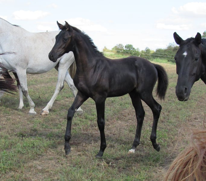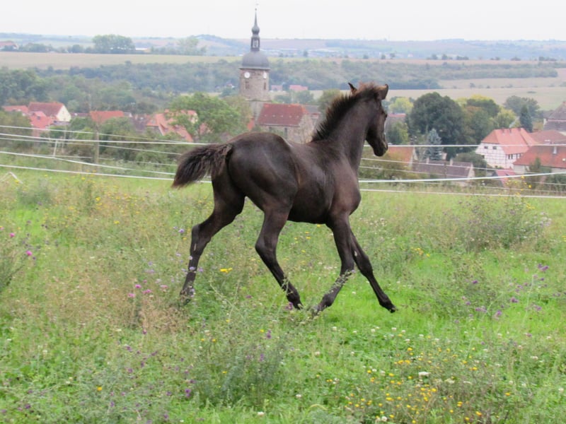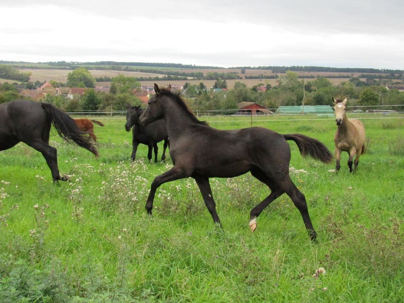 We are selling a very noble black colt by the Trakehner stallion Ivanhoe (Gestüt Hörem). He is incredibly typy and equipped with very good basic gaits, making him certainly interesting for stallion breeders. Our breeding mares all have a very friendly and willing character, so we can expect this from their offspring as well. The expected final height is approximately 170 cm. He is growing up in a mixed herd with two other foals. Our horses spend the summer in large pastures and in winter they live outside in an open stable with a run of about 1 hectare. Raising him is possible if desired. We have been breeding riding horses for 15 years and therefore have many years of experience in breeding and raising. A meeting can be arranged at any time by appointment. In spring 2026, we will also have a then 3-year-old son of Freiherr von Stein for sale. He is currently here for raising with another stallion. If interested, I can gladly provide more information.