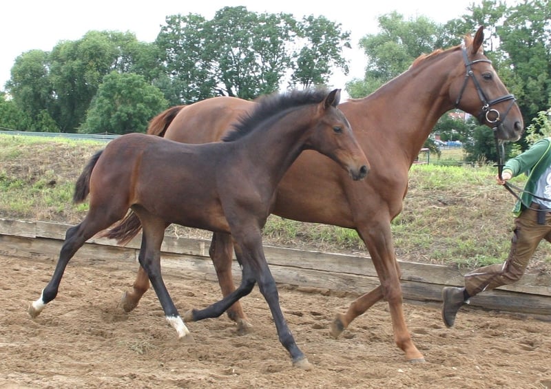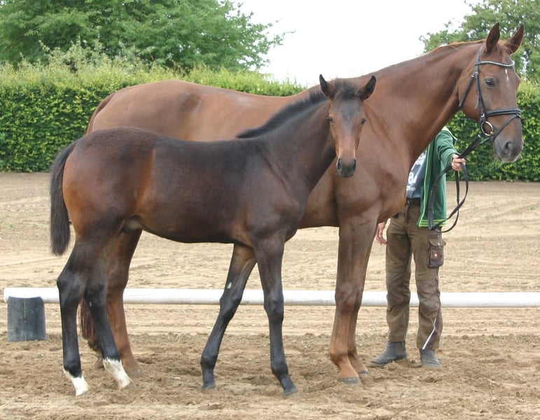Typvolles Hengstfohlen v. Tie Break - Samba Hit I , korrekt im Fundament, mit überdurchschnittlichen Grundgangarten ausgestattet. Vater Tier Break bekam 9,5 für den Trab, den Schritt und die Perspektive, 9,0 für die Rittigkeit und 8,5 für den Galopp – direkt mit einem überlegenen Sieg in seiner ersten Reitpferdeprüfung unter Lukas Fischer gab Tie Break sein Turnierdebüt. Beim Pavo-Cup in Ermelo/NED wurde es Rang fünf, nach Platz drei im Halbfinale. Damit bestätigte Tie Break sein beiden HLP-Siege mit 9,17 und 8,70. Damit bestätigte unser zweifacher Rekord-HLP-Sieger, der seinen Kurz-Test in Vechta mit 9,16 und seine HLP in Schlieckau mit 8,70 gewann, sein herausragendes Talent. MV Samba Hit I war ein bewährter Vererber, der seinen Nachkommen zuverlässig sein ideales Interieur, seinen sehr guten Typ und Rahmen weitergibt. Zudem überzeugen seine Nachkommen mit guter Rittigkeit und viel Bewegungsqualität. Gerade auch in Anpaarung an holländische Genetik hat er viele hocherfolgreiche Sportpferde geliefert. Bei Interesse oder weiteren Fragen freuen wir uns auf Ihre Nachricht, Lassen Sie sich diese Gelegenheit nicht entgehen! 0170/5564286