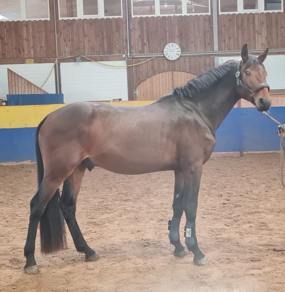 This beautiful stallion was born and raised in a species-appropriate and healthy environment. He has been gently backed and is now seeking his new family. He is well-behaved and easy to handle. He stands on a solid foundation and has very good movement. He jumps freely in a relaxed manner and has already jumped a little under saddle. He has been with a professional for the past 12 weeks and is fully rideable by an amateur rider. He has already been confidently presented in a riding horse test.