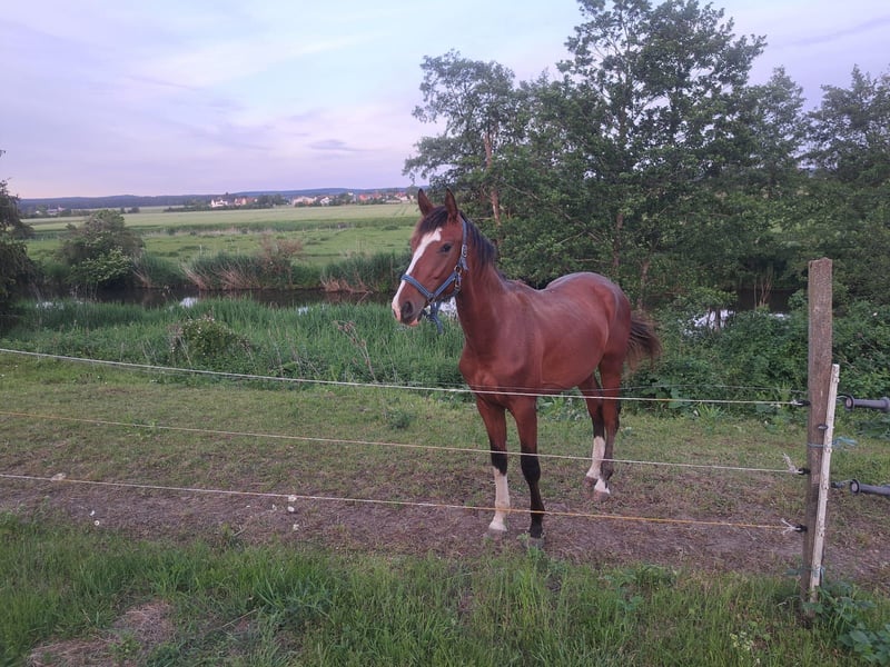 **Advertisement for sale: German Sport Horse - Stallion** A promising young stallion is for sale: - **Breed:** German Sport Horse - **Sex:** Stallion - Year of birth:** 2022 - **Color:** bay - Height:** 170 cm - **Discipline:** Dressage This magnificent stallion impresses with his elegant appearance and great potential in dressage. With his harmonious conformation and impressive height of approx. 172 cm, he is a real eye-catcher. He is already very willing and talented to learn. Interested parties are cordially invited to see the qualities of this young horse for themselves. For further information and to arrange a viewing appointment, please do not hesitate to contact us. Contact us today and secure this exceptional young talent for yourself!