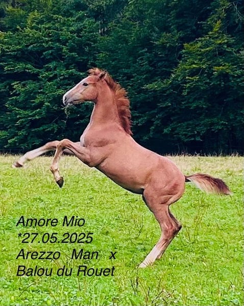 Amore Mio ist ein tolles, im Hengsttyp stehendes, korrektes, sehr zugewandtes Fohlen. Beim Birkhof Fohlenchampionat erreichte er den 4. Platz mit einer Endnote von 9,25! Sein Vater Arezzo Man, amtierender Bundeschampion und momentan in aller Munde, qualifizierte sich erneut sensationell mit 9,8für das diesjährige Championat. Die Mutter, Balouba, eine Tochter des Balou du Rouet, war selbst im Sport erfolgreich bis zu Klasse M**.