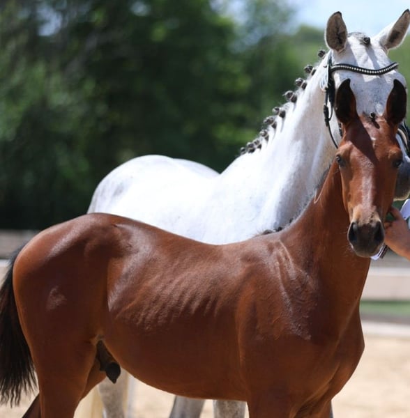 Upsala is a stunning, tall and elegant colt by Unstoppable de la Pomme x Cornet Obolensky. He is very well-behaved in daily handling and with the farrier, always eager to please. He has a correct conformation and three excellent gaits. Sire Unstoppable de la Pomme is an exceptional young sire, promising a bright international showjumping career. A true athlete of the finest kind—expressive, ambitious, brave and powerful, ideally suited for modern top-level sport. His pedigree confirms this quality at the highest level: his sire Udarco van Overis successfully competed up to 1.60 m with German rider Sarah Nagel-Tornau. His dam, Gazelle de la Pomme, competed up to 1.35 m and descends from the world-renowned Belgian breeder Joris de Brabander (Stal de Muze). She is a 75% sister to the famous stallion Vagabond de la Pomme (Pénélope Leprevost, FRA). In his first show season, Unstoppable de la Pomme impressed with multiple wins and top placings. During his 14-day performance test, he earned several scores of 9.0, particularly for jumping ability and willingness to perform. His first foal crop shows strong type, good movement, and growth potential. This de Muze line is considered Belgium’s most successful damline, producing numerous 1.60 m Grand Prix horses. Maternal lineage • 1st generation: Holst. line 1086 • 3rd generation: approved stallions, e.g. Dicontendro (USA 2016) by Diarado • 4th–5th generations: many successful international showjumpers up to 1.60 m, including Chablis 105, Curiboh, FBW Coulthard, Tshakira 2, Captain Jack E, Chocolate E, Contact You, Charming Scarlett E, and others. *The passport has been requested and is still being processed by the studbook, please take possible delays into account.
