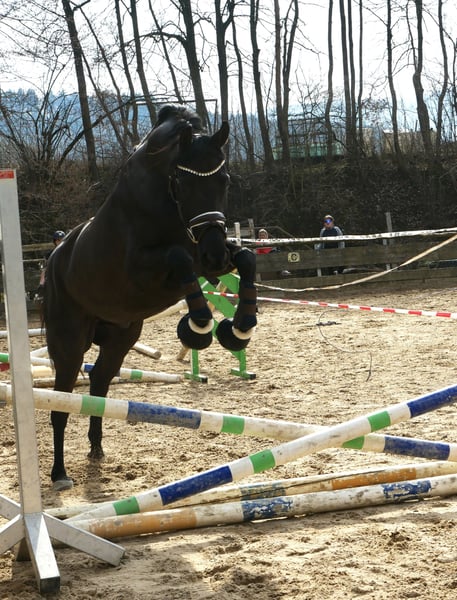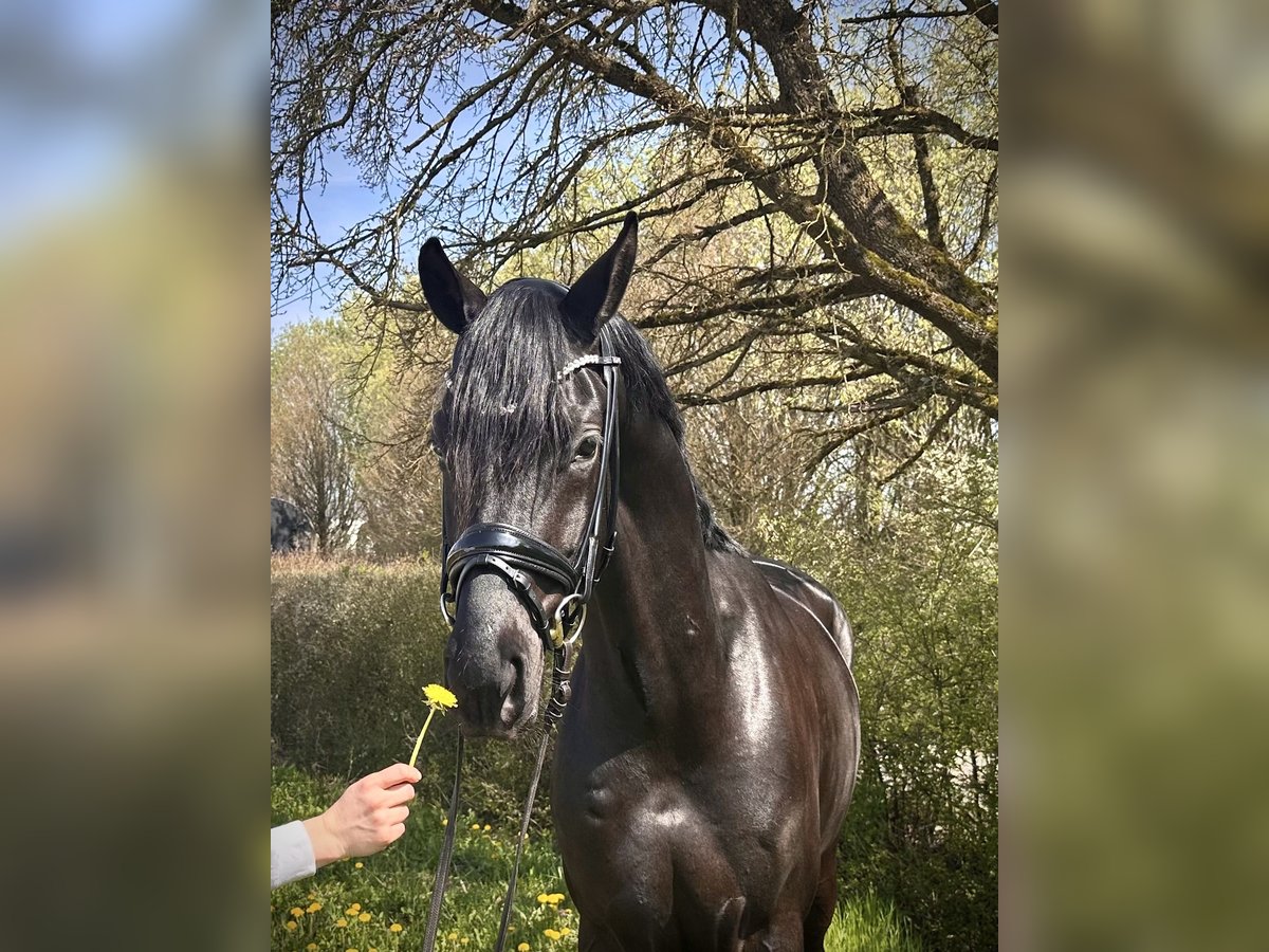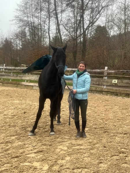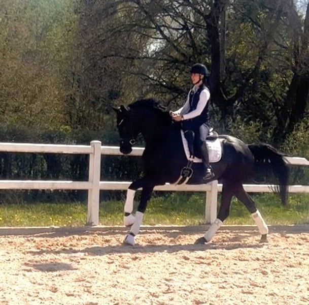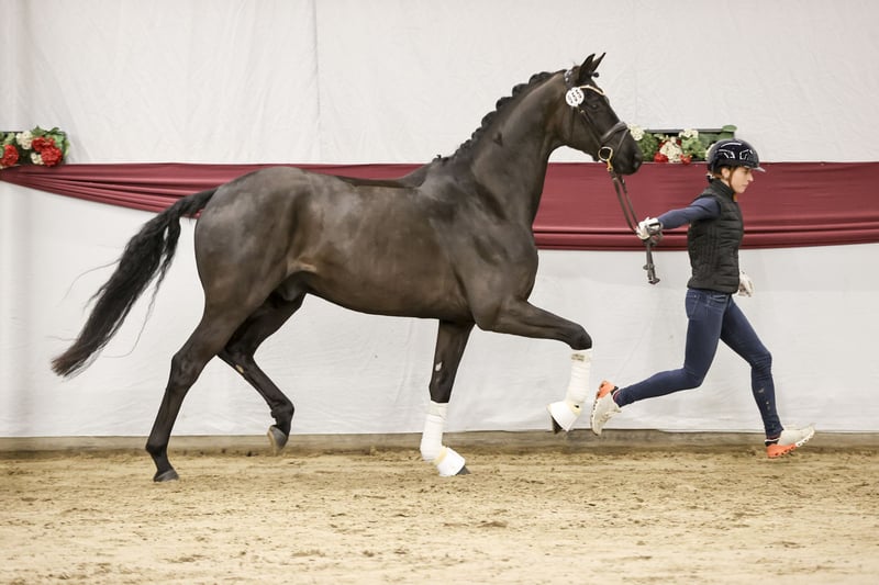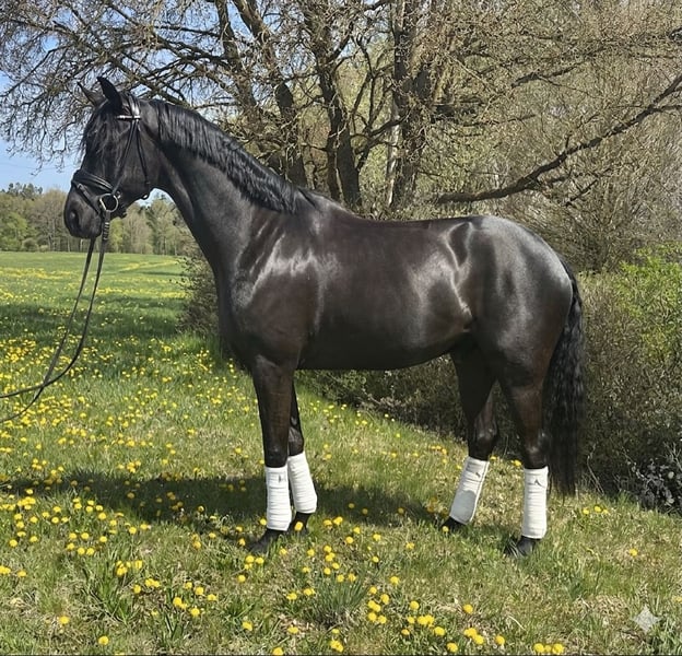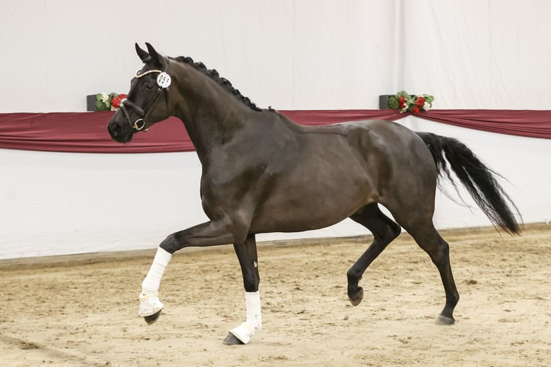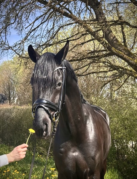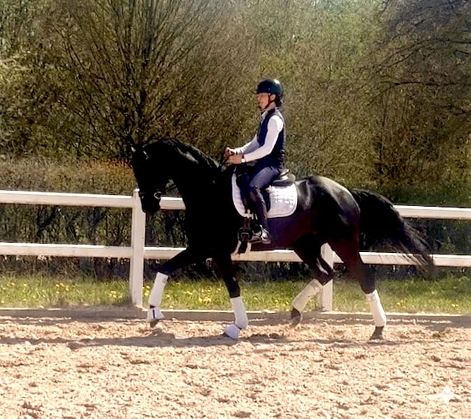 Michelangelo- ein wahres Ebenbild seines Vaters Morricone und ein echter Blickfang im Stall. Dieser elegante Rappe überzeugt nicht nur durch seine Optik, sondern auch durch seine inneren Werte. Er verfügt über drei sehr gute Grundgangarten, wobei besonders der raumgreifende Schritt und der ausdrucksstarke Galopp hervorzuheben sind– ideale Voraussetzungen für den Dressursport, aber auch für vielseitige Einsätze. „Michel“ wurde behutsam aufgezogen und altersgerecht angeritten (4Monate). Er kennt bereits Geländeritte, entspannte Spaziergänge sowie erste Stangenarbeit und zeigt sich dabei stets lernwillig und aufmerksam. Im Umgang ist er immer freundlich und ausgeglichen, er wartet jeden Tag auf „seinen Menschen“. Trotzdem ein Pferd mit „Geist“, das gefördert werden möchte und eine feine Hand zu schätzen weiß. Wir wünschen uns für diesen Charmeur einen einfühlsamen Reiter, der Freude daran hat, ihn weiter auszubilden und sein neuer Freund zu werden. Nur in liebevolle und passende Hände. Röntgenbilder ohne Befund liegen vor. P.S. Man muss ihn live gesehen haben!